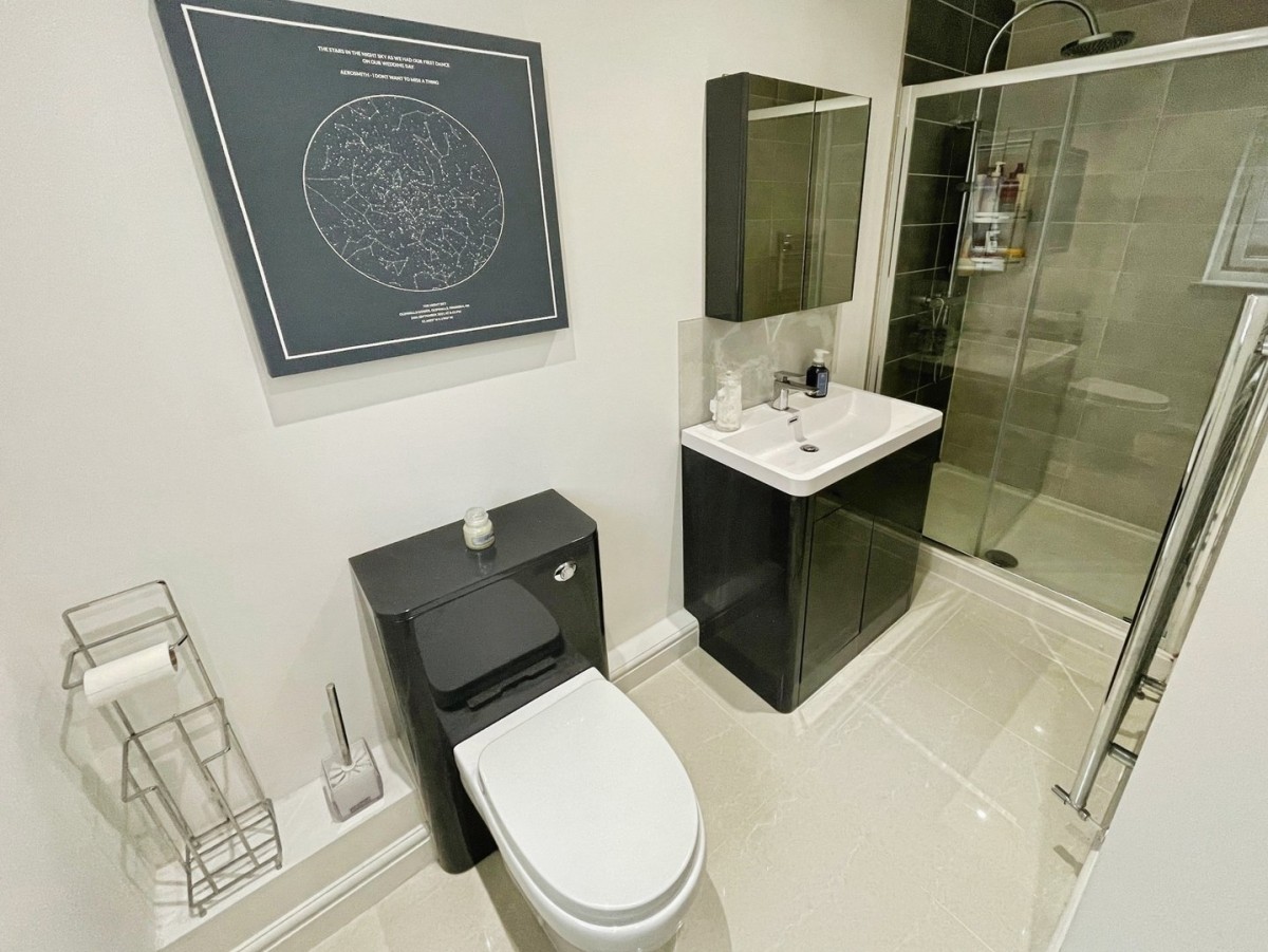 1.77m x 3.39m (5' 10" x 11' 1") Plastered and emulsioned ceiling with inset chrome spot lights, plastered and emulsioned walls, skirting, tiling to the splash backs and tiled flooring. Three piece suite comprising vanity unit with w.c. and wash hand basin with chrome mixer tap and glass splash back and large walk in shower with overhead chrome mixer shower and handheld shower attachment with sliding glass door. Wall mounted mirrored cabinet and chrome towel radiator. PVCu frosted double glazed window overlooking the side of the property.