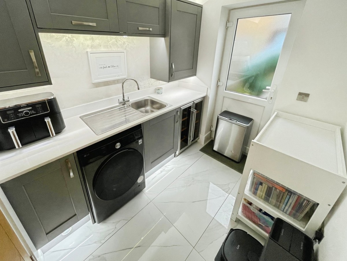 2.10m x 2.26m (6' 11" x 7' 5") Plastered and emulsioned ceiling with centre light, plastered and emulsioned walls, skirting and tiled flooring. A range of base and wall units with complementary work surfaces housing an inset stainless steel sink with chrome mixer tap. Space for freestanding washing machine and freestanding wine cooler. Under counter lighting, PVCu frosted double glazed door leading out to the rear garden. Door leading into a storage cupboard with built in shelving and wall mounted electric consumer box and lighting.