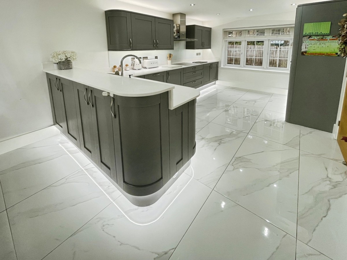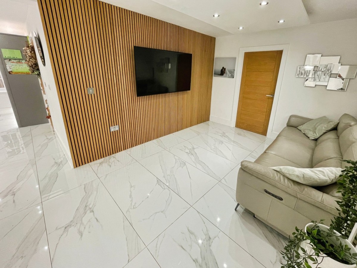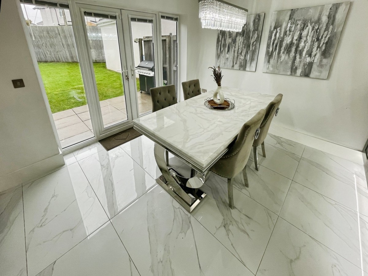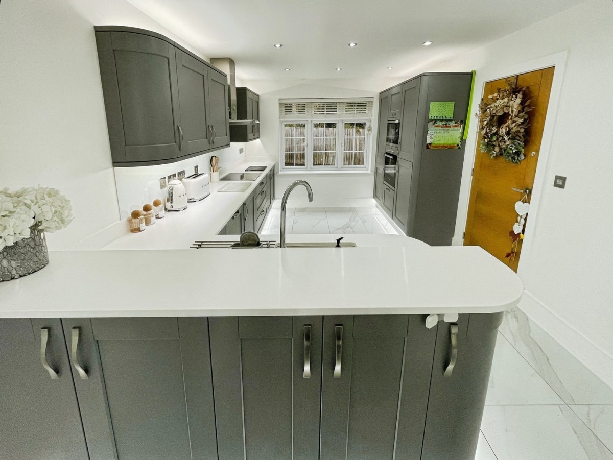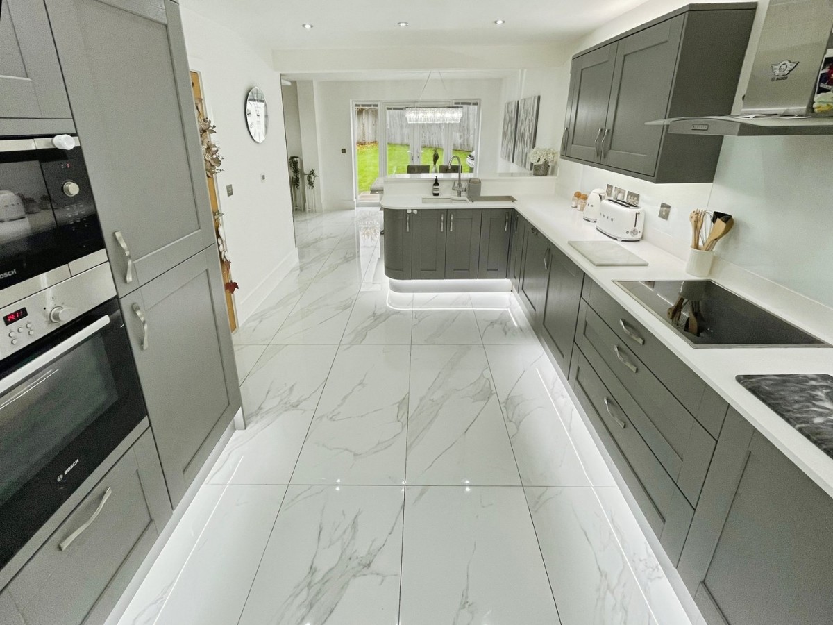 3.25m x 7.61m (10' 8" x 25' 0") Plastered and emulsioned ceiling with inset chrome spot lights, centre light over the dining table, plastered and emulsioned walls, skirting and tiled flooring. A range of base and wall units in shaker style grey with wood effect grain and square edge complementary work surfaces housing an inset one and half ceramic sink with chrome mixer tap and hot water tap. Four ring electric hob with overhead chrome and glass extractor fan with glass splash back. Integrated oven, microwave oven, dishwasher and fridge/freezer. Under counter lighting and space for good sized family table and chairs. PVCu double glazed window overlooking the front and PVCu double glazed French doors with PVCu double glazed side panels leading out to the rear garden. Under floor heating and opening into family room.
