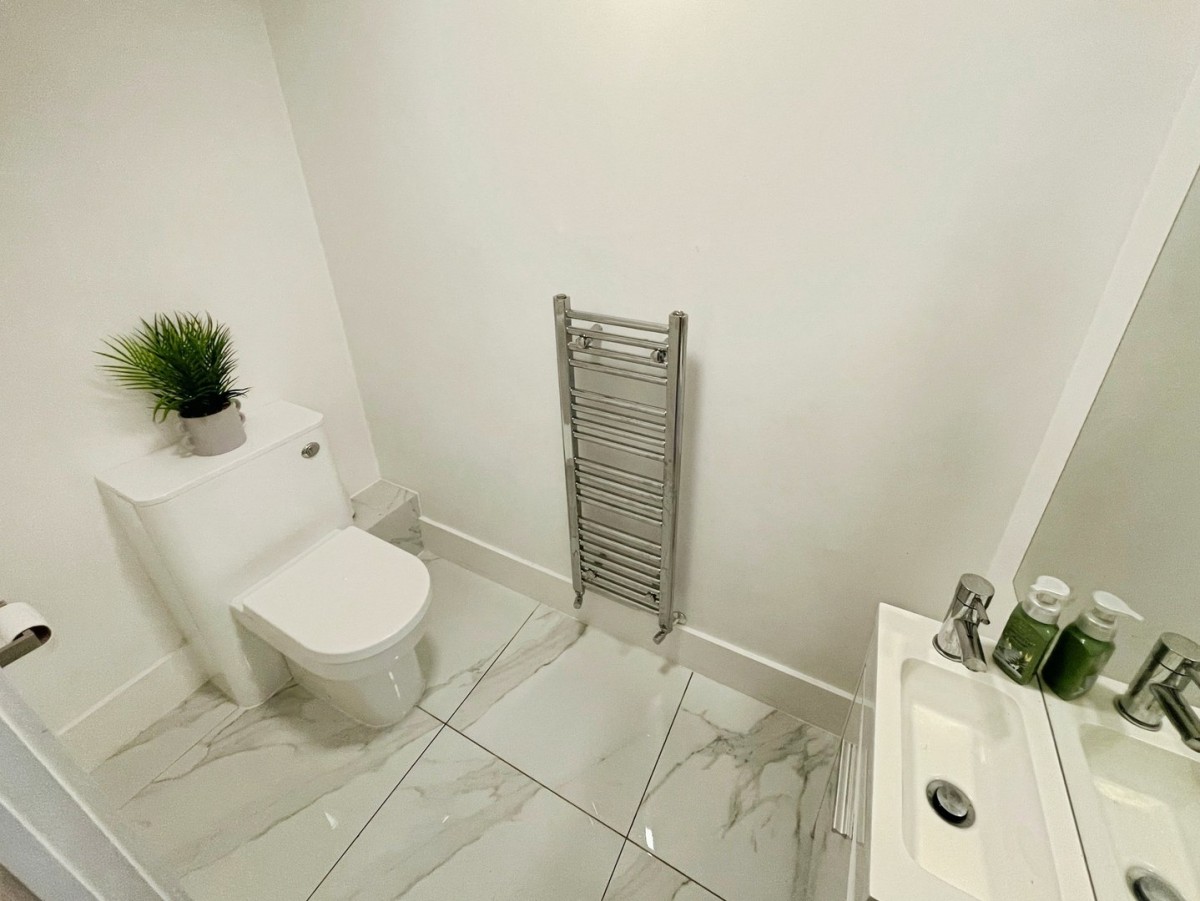 1.32m x 2.03m (4' 4" x 6' 8") Plastered and emulsioned ceiling with centre light and extractor fan, plastered and emulsioned walls, skirting and a continuation of the tiled flooring. Two piece suite comprising vanity unit with ceramic wash hand basin and chrome mixer tap, w.c. and large wall mounted mirror. Wall mounted chrome towel radiator.