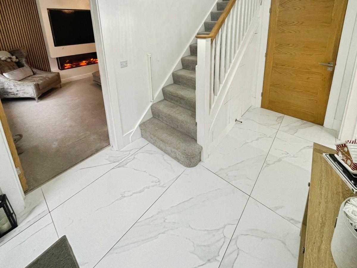 Plastered and emulsioned ceiling with pendant light, smoke alarm, plastered and emulsioned walls, skirting and tiled flooring. Built in storage under the stairs. Doors leading to the lounge, kitchen/diner and downstairs w.c. and stairs leading to the first floor.