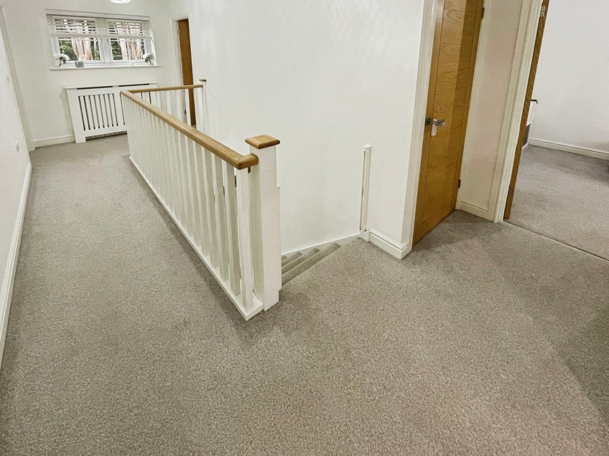 Via stairs with fitted carpet, spindle balustrade and oak handrail. Plastered and emulsioned ceiling with two pendant lights, plastered and emulsioned walls, skirting, fitted carpet and radiator. PVCu double glazed window overlooking the front of the property. Doors leading to four bedrooms, family bathroom and airing cupboard with shelving and radiator.