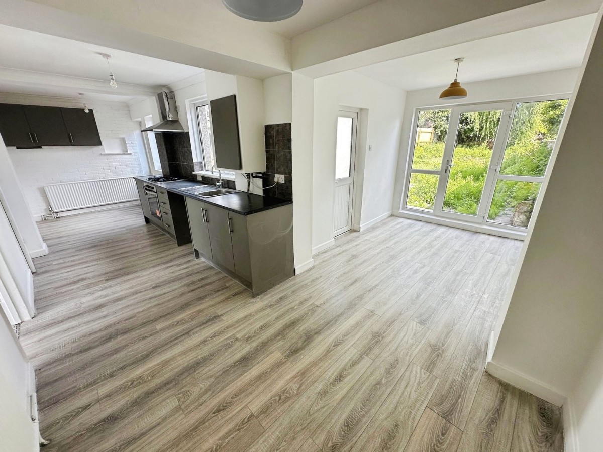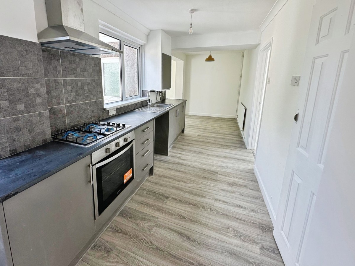 Emulsioned and coved ceiling, emulsioned walls, skirting and wood effect laminate floor. Two PVCu double glazed windows overlooking rear garden. Part glazed PVCu door leading to the rear garden. The kitchen spans the entire width of the property. Arranged with wall mounted and low level kitchen units with brushed chrome handles and a complementary roll top work surface with ceramic tiles to the splash back. Inset sink with swan neck tap and drainer. Integrated electric oven with four ring gas hob and overhead extractor. Plumbing for automatic washing machine, space for fridge freezer and further low level appliances. Under stairs storage housing the electricity meter and a square archway through into the sun room.