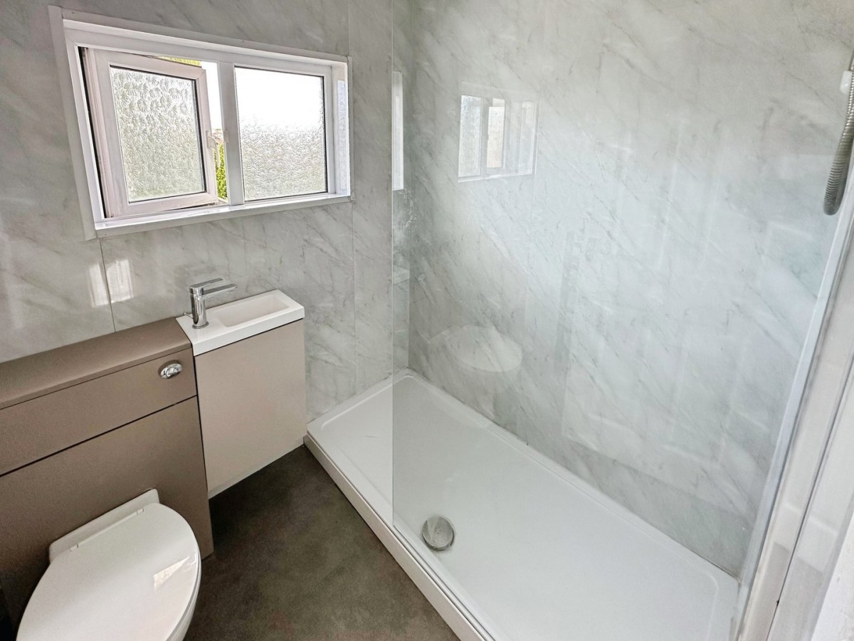 Emulsioned ceiling with central light fitting. Respatex to the wall, wall mounted heated towel rail and vinyl flooring. Three piece suite comprising W.C, wash hand basin with chrome mixer tap and a large walk in shower housing a wall mounted electric shower and side glazed screen.