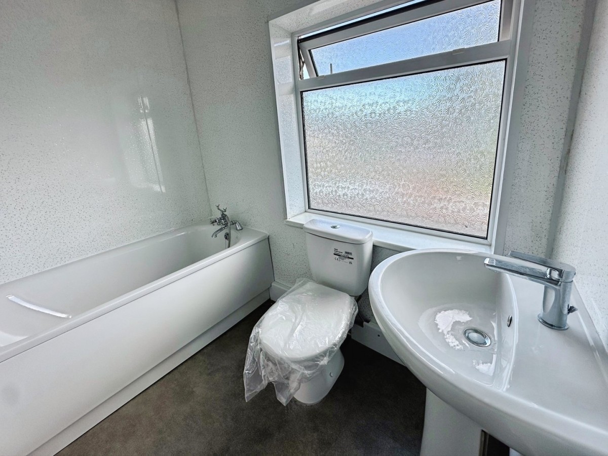 PVCu frosted glazed window overlooking the rear of the property. Respatex ceiling and walls with central light fitting, vinyl floor and wall mounted heated towel rail. Three piece suite in white comprising W.C, wash hand basin with chrome mixer tap and a bath with chrome mixer tap and hand attachment.