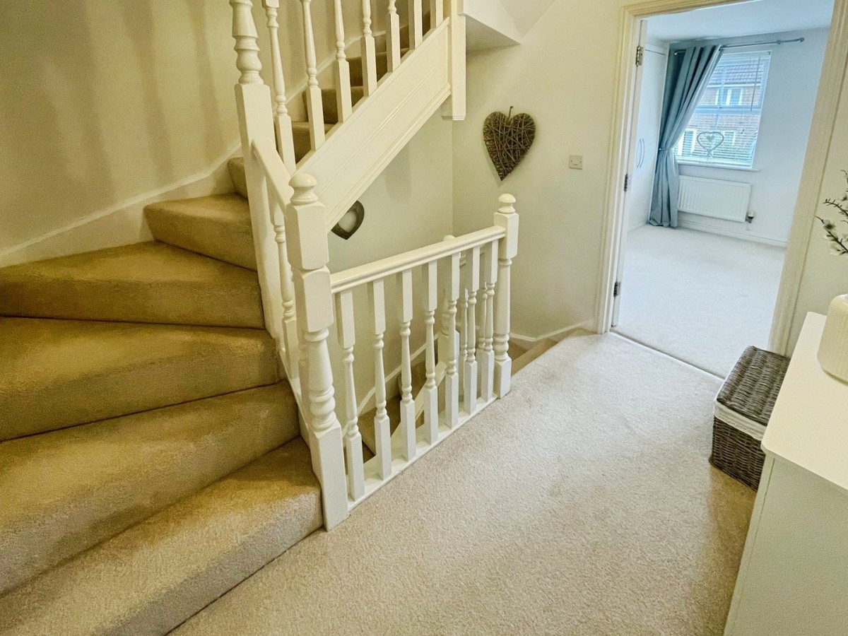 Via stairs with fitted carpet, spindle balustrade and handrail. Plastered and emulsioned ceiling with pendant light, smoke alarm, plastered and emulsioned walls, skirting, fitted carpet, radiator and carbon monoxide alarm. Doors leading to master bedroom and lounge.