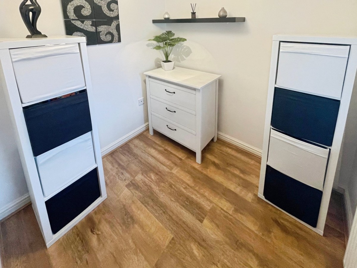 Plastered and emulsioned ceiling with pendant light, plastered and emulsioned walls, skirting, laminate flooring in wood effect with fitted carpet mat. Wall mounted electric consumer box and radiator. Doors leading to the office, downstairs WC, kitchen/diner/lounge and stairs leading to the first floor. Airing cupboard housing the gas boiler with shelving.