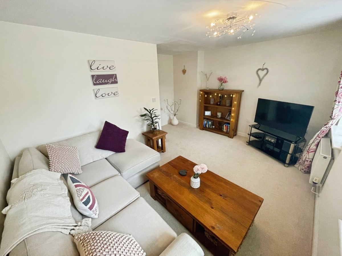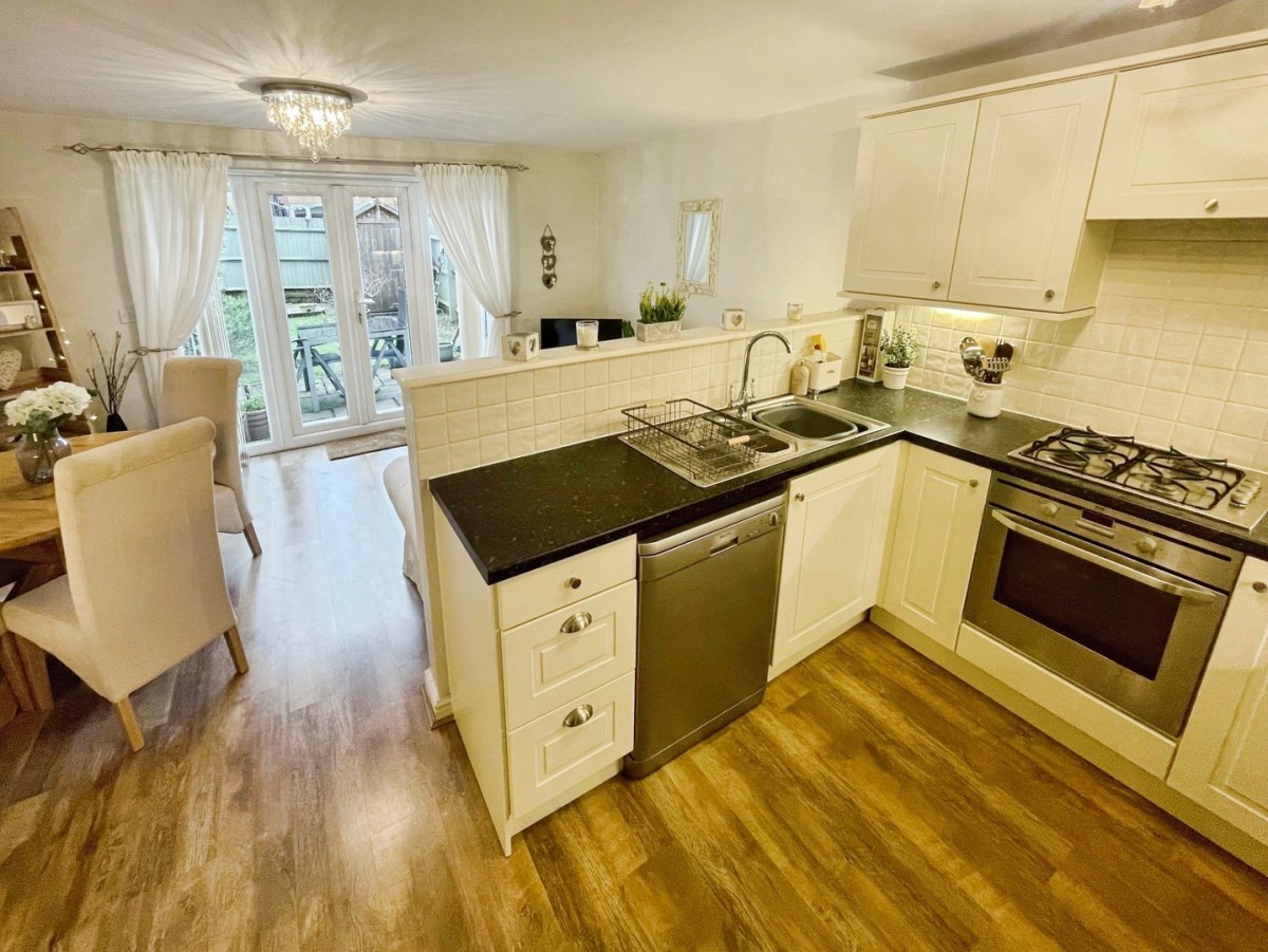4.31m x 5.59m (14' 2" x 18' 4") Plastered and emulsioned ceiling with two lights, one to the kitchen and lounge area. Plastered and emulsioned walls with tiling to the splash back areas to the kitchen, skirting and a continuation of the laminate flooring. A range of base and wall units in shaker style cream with complementary roll top laminate work tops, space for dishwasher, washing machine and freestanding fridge/freezer. Integrated oven with four ring gas hob and overhead extractor and one and half stainless steel sink with chrome mixer tap. Space for dining table and chairs, sofa and TV unit. Two wall mounted radiators, PVCu double glazed French doors leading out to the rear garden and PVCu double glazed side panel.