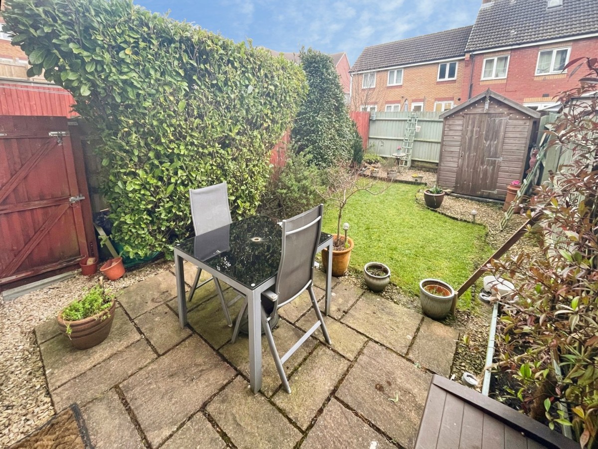 Enclosed rear garden with side access which is shared with the neighbouring property enclosed with a wooden gate. The first section of the garden is laid to patio with decorative stone, further area laid to lawn and a further tier laid to decorative stone with mature shrubbery and base for freestanding shed.