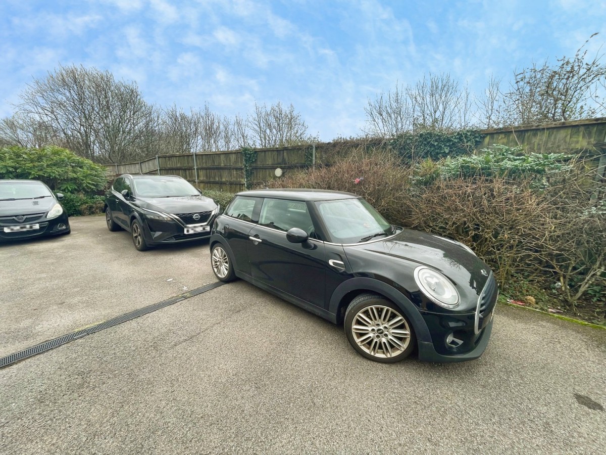 Small area of decorative stone to the front with mature shrubbery. Two dedicated parking spaces on the corner.