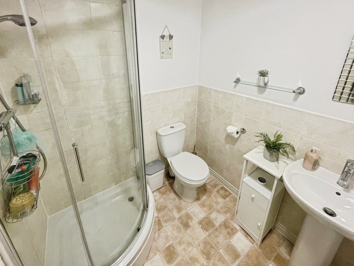 1.78m x 1.79m (5' 10" x 5' 10") Plastered and emulsioned ceiling with centre light, extractor fan, plastered and emulsioned walls with full height tiling around the shower and half height to the WC and sink area. Skirting, vinyl flooring in tile effect. Three piece suite comprising corner curved shower tray with sliding glass door and overhead chrome mixer shower, low level WC and pedestal wash hand basin with chrome mixer tap. Wall mounted chrome towel rail radiator.