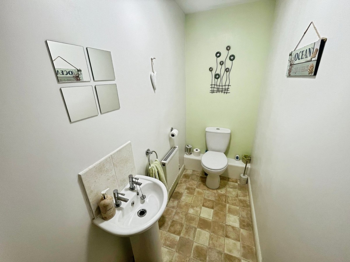 1.03m x 2.18m (3' 5" x 7' 2") Plastered and emulsioned ceiling with centre light, extractor fan, plastered and emulsioned walls, skirting, radiator and vinyl flooring in tile effect. Two piece suite comprising low level WC and pedestal wash hand basin with chrome taps and tiled splash back.