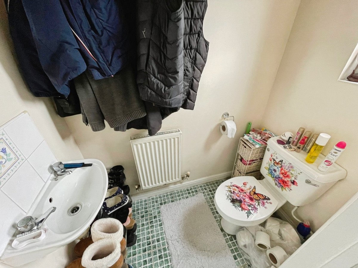 0.95m x 1.67m (3' 1" x 5' 6") Textured ceiling, centre light, emulsioned walls, frosted PVCu double glazed window overlooking the front of the property, radiator, skirting and tiled flooring. Two piece suite comprising low level WC and wall hung sink with tiling to splash back areas.