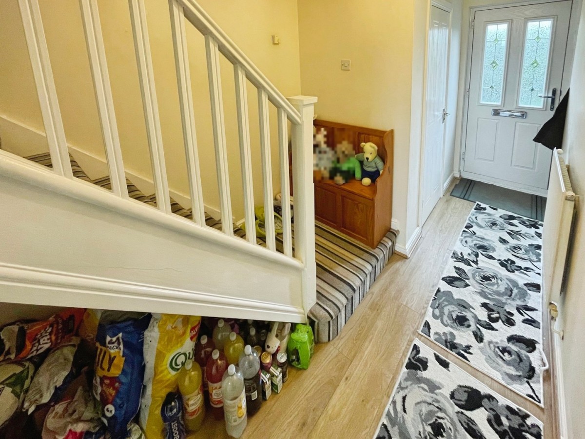Via part frosted glazed composite door into the entrance hall finished with textured ceiling, centre light, smoke alarm, emulsioned walls, radiator, skirting and wood effect laminate flooring. Doors leading to downstairs WC, lounge/diner and kitchen. Stairs leading to the first floor.