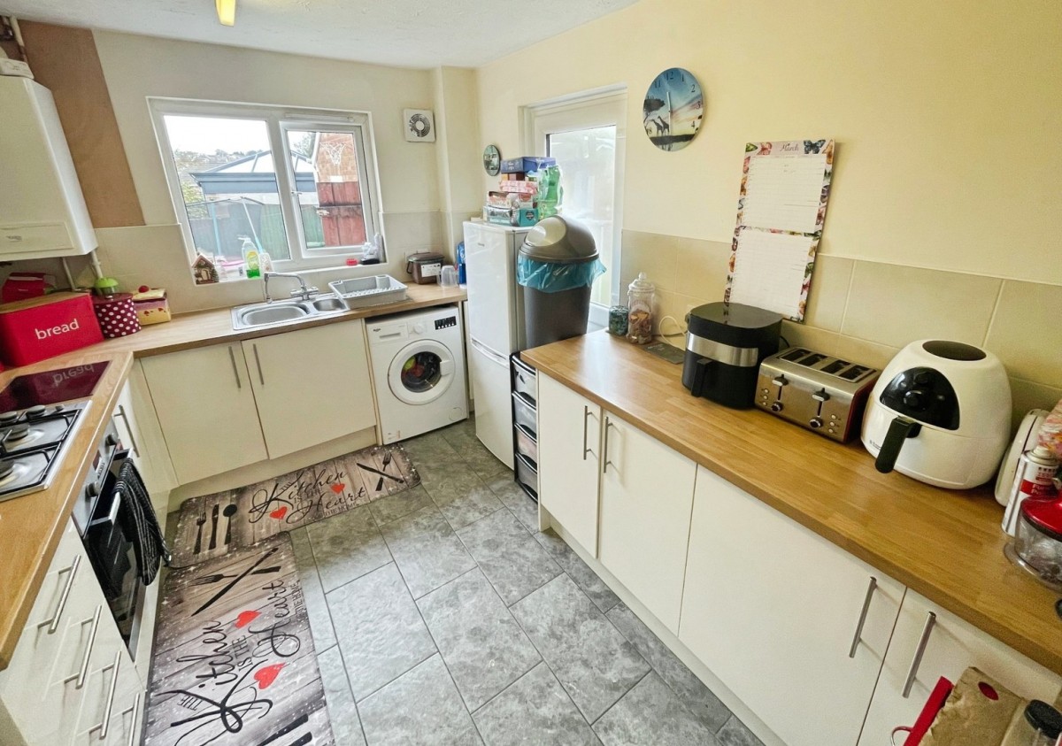 2.68m x 3.57m (8' 10" x 11' 9") Textured ceiling, centre strip light, emulsioned walls with tiling to splash back areas, PVCu double glazed window overlooking the rear of the property, PVCu frosted door leading out to the rear garden, skirting and tiled flooring. A range of wall and base units in a gloss cream with complementary roll top laminate work surface. Space for freestanding fridge/freezer. Integrated electric oven with four ring gas hob and overhead extract fan. One and a half stainless steel sink with chrome mixer tap and space for freestanding washing machine. Wall mounted gas combination boiler.