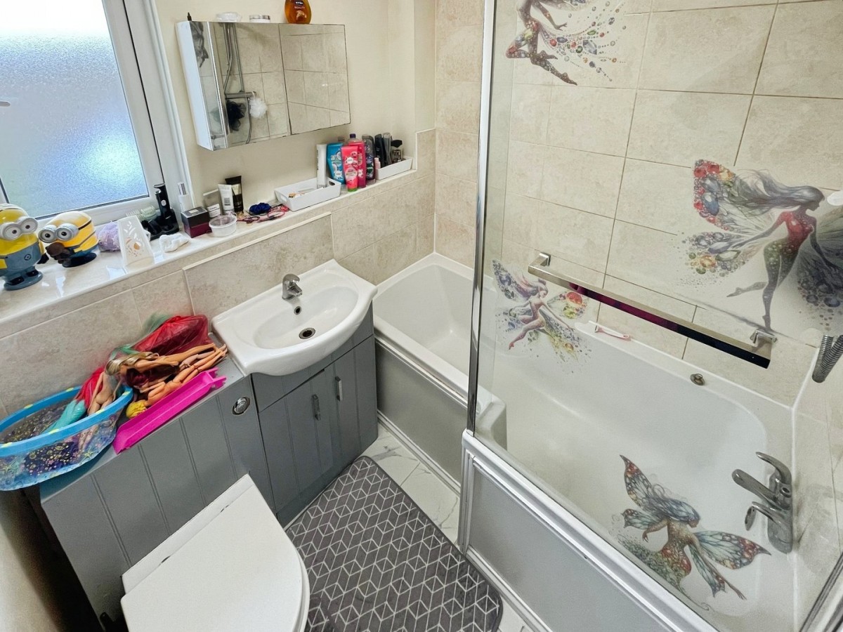 1.85m x 1.85m (6' 1" x 6' 1") Textured ceiling, centre light, extractor fan, part emulsioned/ part tiled walls, wall mounted mirrored cabinet, shaver point, PVCu frosted double glazed window overlooking the rear, radiator, skirting and tiled flooring. Three piece suite comprising vanity WC unit, vanity sink unit with chrome mixer tap and L shaped bath with chrome mixer tap, overhead chrome mixer shower and folding glass screen.