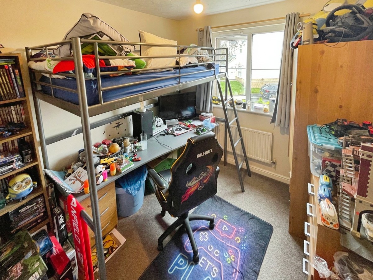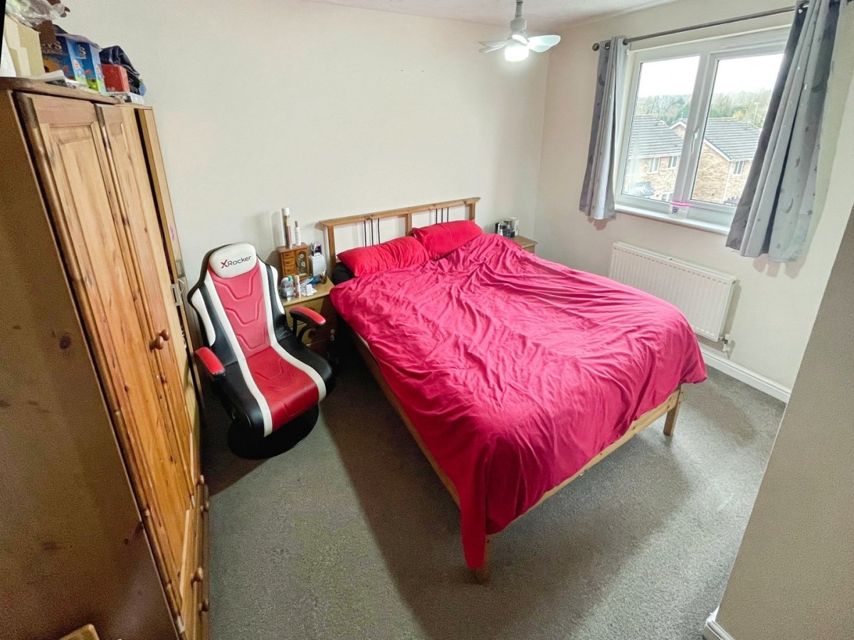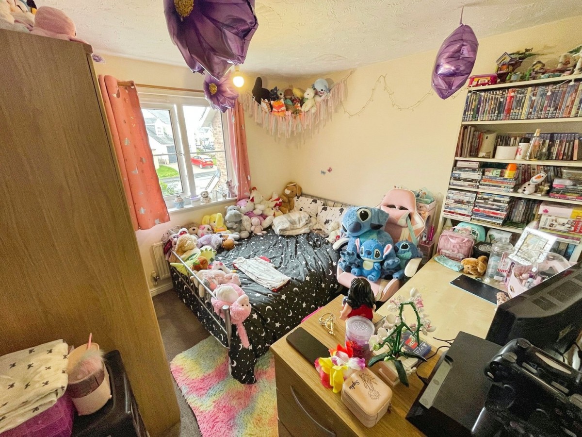 2.45m x 2.78m (8' 0" x 9' 1") Textured ceiling, centre pendant light, emulsioned walls, PVCu double glazed window overlooking the front, radiator, skirting and fitted carpet. Door to storage over the stairs with shelving.