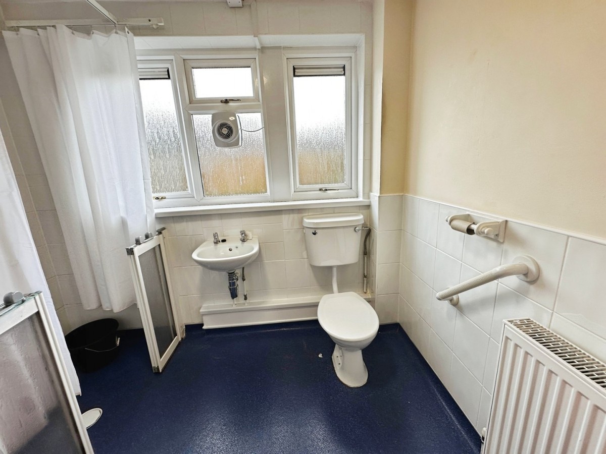Shower room overlooking the rear via PVCu frosted glaze window with built-in extractor central, light fitting, half height ceramic tiles to the wall and vinyl floor. Low-level WC ,wall mounted wash hand basin, walk mobility shower with wall mounted electric shower, half height door and fold up seat.