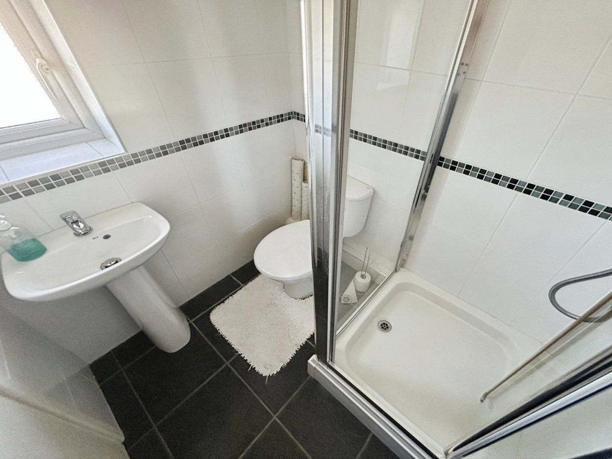 Textured ceiling, centre light, fully tiled walls with decorative border tile, PVCu frosted glazed window overlooking the side of the property and slate effect tiled flooring. Three piece suite comprising WC, pedestal wash hand basin with chrome mixer tap and single shower cubicle with plastic shower screen and wall mounted chrome shower.