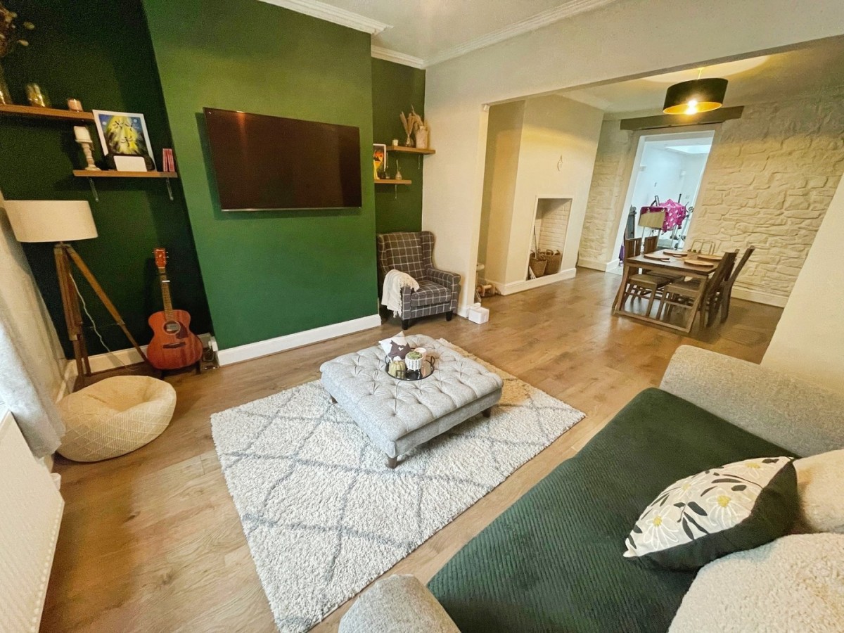 Emulsioned ceiling, pendant light, original coving, emulsioned walls, PVCu double glazed window overlooking the front of the property, radiator, feature chimney breast with built in shelving either side, skirting and wood effect laminate flooring. Opening into the dining.
