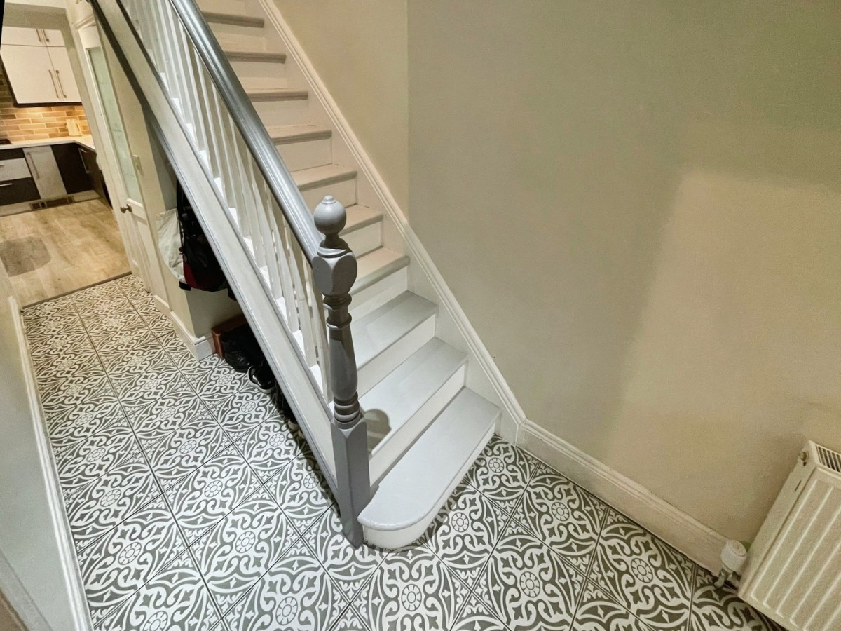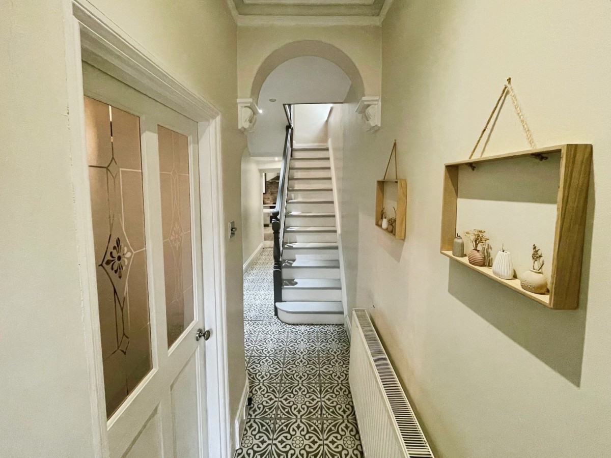 Emulsioned ceiling, centre spot lights, original coving, emulsioned walls, skirting and original feature archway, radiator and a continuation of the tiled flooring. Stairs leading to the first floor. Doors leading to downstairs WC, kitchen, lounge/diner and a secondary door leading to the diner.