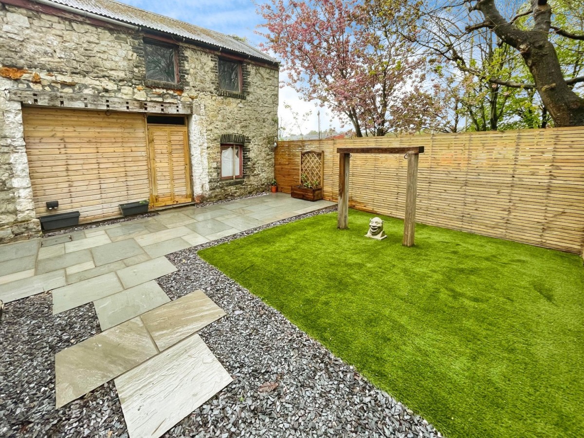 Good sized enclosed and private rear garden, wooden covered area ideal for a hot tub, two areas laid to artificial grass, grey Indian sandstone patio and decorative slate borders. Wooden door leading to outbuilding currently used as storage but could be a workshop area.