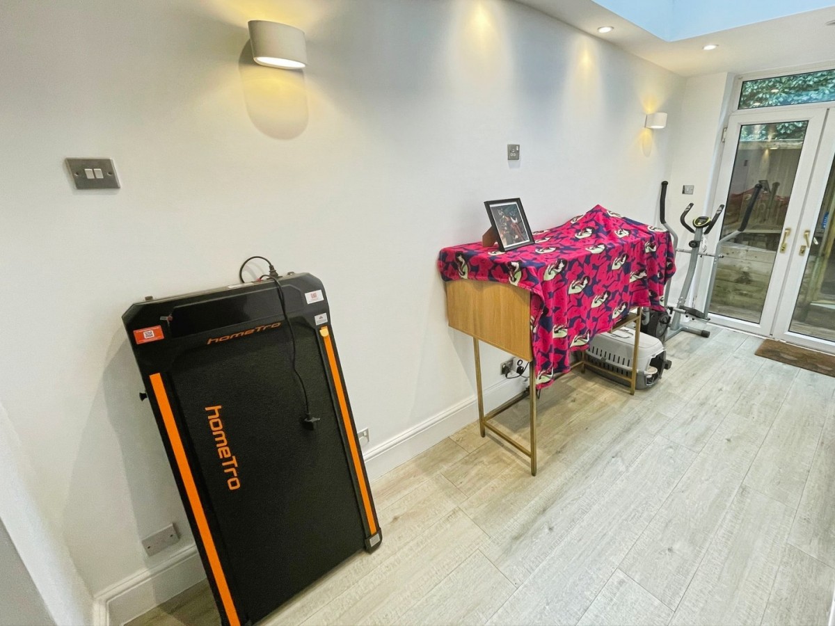 Emulsioned ceiling with sunken spot lights, lantern sky light, emulsioned walls, PVCu double glazed double doors leading out to the rear garden, skirting and grey wood effect laminate flooring with under floor heating. Opening into the kitchen.