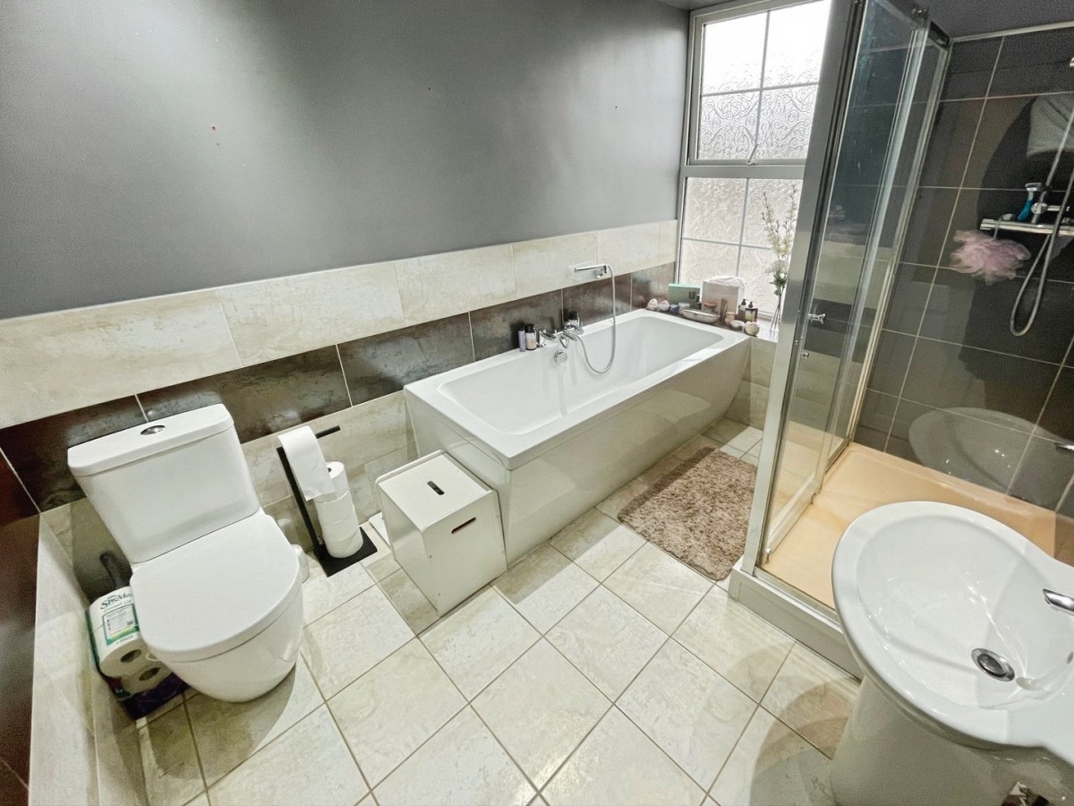 Emulsioned ceiling, sunken spot lights, extractor fan, part emulsioned/ part tiled walls, frosted PVCu double glazed window overlooking the front, chrome towel radiator, wall mounted mirror cabinet and tiled flooring with under floor heating. Four piece suite comprising low level WC, pedestal sink with chrome mixer tap, large walk in shower with overhead chrome shower mixer, hand held attachment and sliding glass screen, bath with chrome mixer tap and chrome hand held shower attachment.