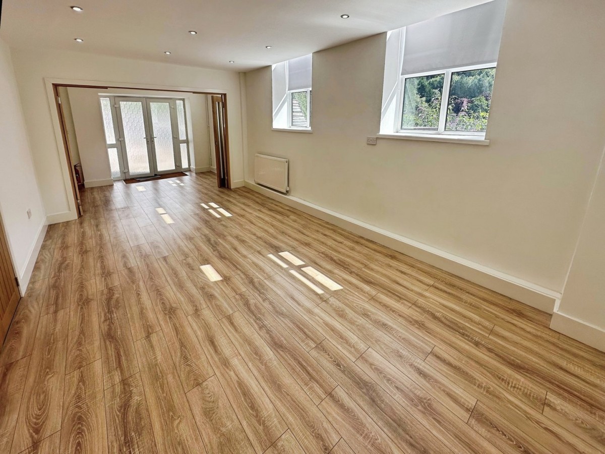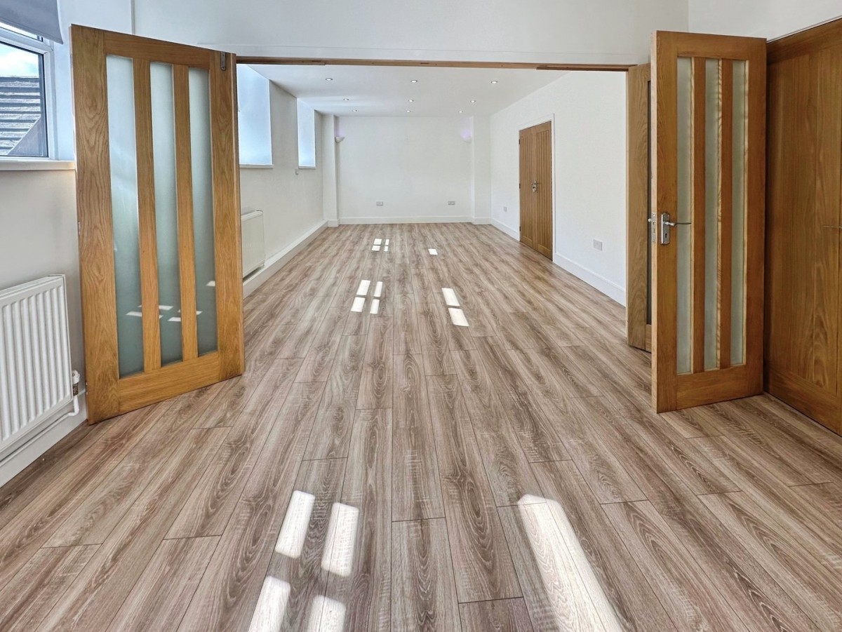 PVCu double glazed window to the side with fitted roller blind and finished with emulsioned ceiling, recessed LED spot lights, ceiling mounted smoke detector, emulsioned walls and wood effect laminate flooring. Timber double doors leading into room 2. Timber frosted glazed bi-fold doors leading through to room 1.