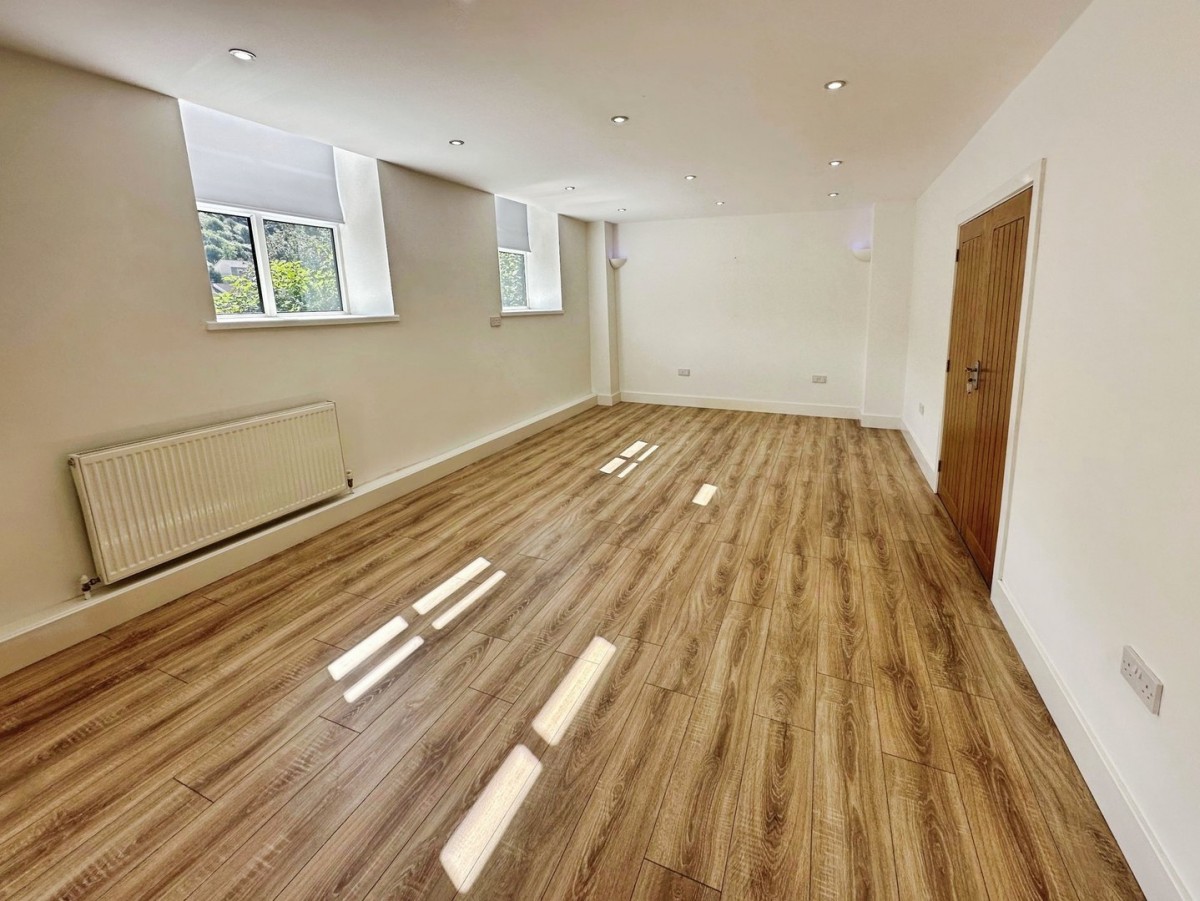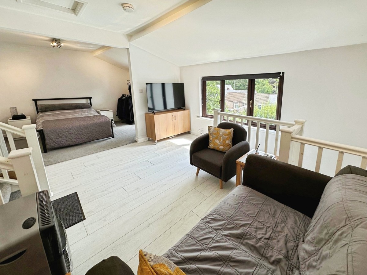 Overlooking the rear via PVCu double glazed window with a fitted roller blind and finished with access to loft storage, ceiling mounted smoke detector, central spot lights, emulsioned walls, wall mounted electric fuse box, skirting and laminate floor. Hard wood timber door leading out onto Llewellyn street via steps with double balustrade. Open arch through to bedroom.