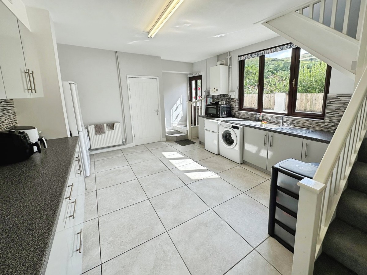 PVCu double glazed window overlooking the rear with a fitted roller blind and finished with emulsioned ceiling, central fluorescent strip light, ceiling mounted smoke detector, emulsioned walls, skirting and ceramic tiled floor. Wall mounted gas fired combination boiler. A range of low level and wall mounted units in high gloss grey with brushed chrome handles and a complementary roll top work surface with ceramic tiles to all splash back areas. Inset sink with mixer tap and drainer. Space for high level fridge/freezer. Plumbing for automatic washing machine,space for dishwasher and space for tumble dryer. Door into shower room. Stairs with fitted carpet and wooden balustrade to the first floor.