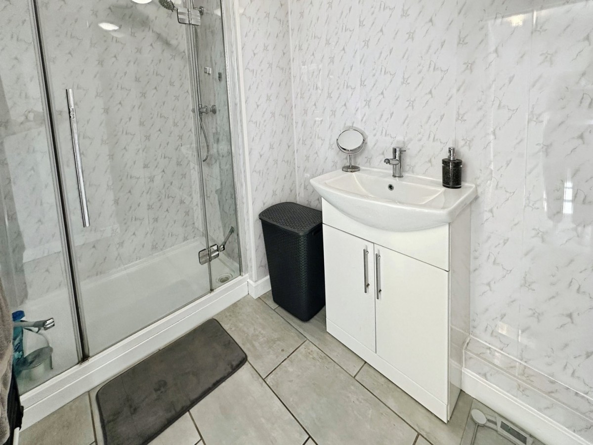 Skimmed ceiling, two light fittings, respatex walls, wall mounted heated towel rail and ceramic tiled flooring. Three piece suite in white comprising WC, wash hand basin with chrome mixer tap and vanity unit, large walk in shower cubicle housing a plumbed shower with a rainwater head, hand attachment and fully glazed door.