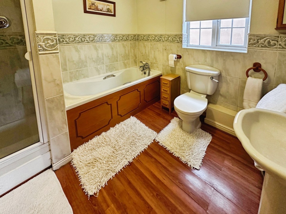 PVCu frosted glazed window to the side with a fitted roller blind. Laminate floor. Four piece suite in white with WC, wash hand basin, bath with chrome mixer tap and shower attachment .Separate shower cubicle housing a plumbed shower with ceramic tiles to all splashback areas.