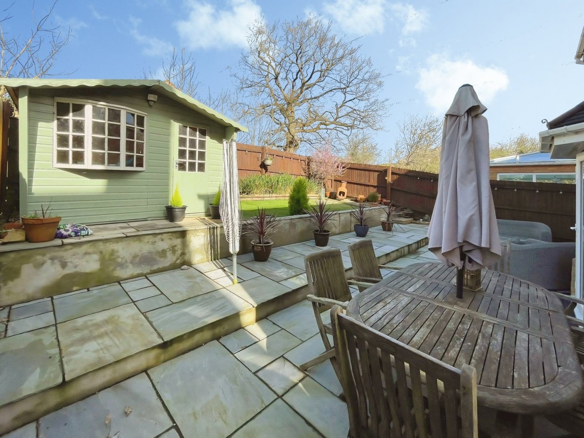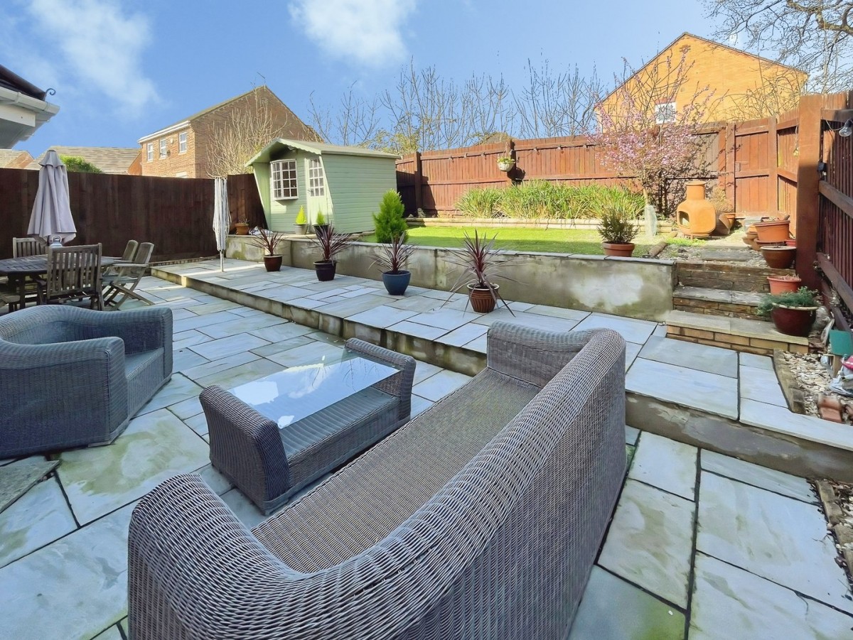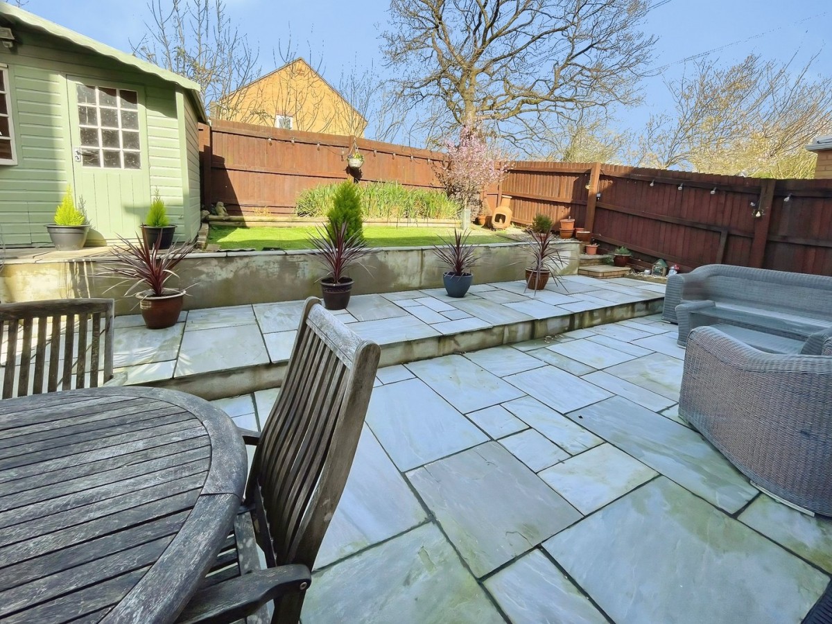 Enclosed rear garden laid to 2 tiers of sandstone patio with steps leading up to a level area of artificial grass with a storage shed and side access back to the front
