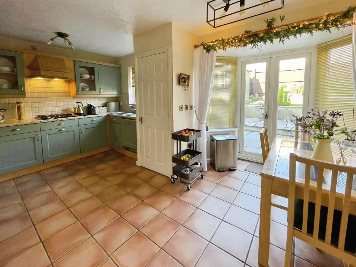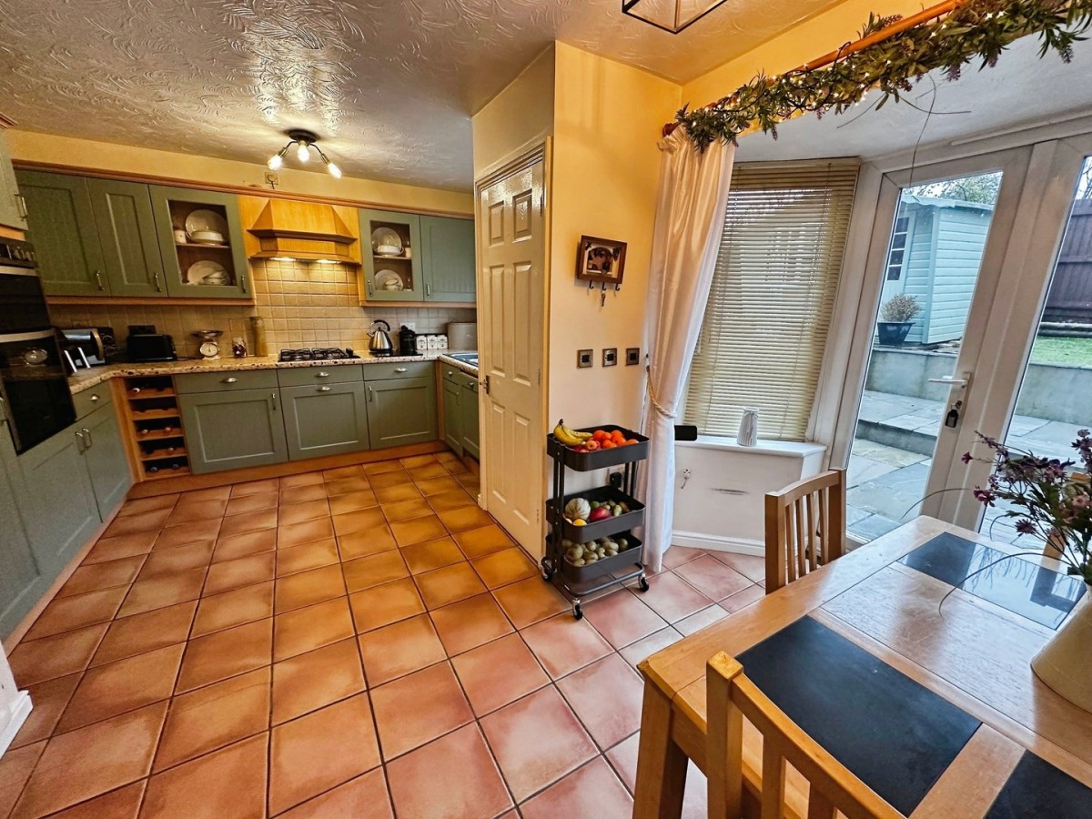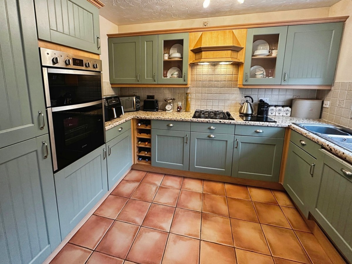 4.8m x 3.35m (15' 9" x 11' 0") Kitchen - Overlooking the rear garden via PVCu double glazed window with a fitted Venetian blind and finished with central spotlight, ceramic tiles to the floor. Arranged with wall mounted and low-level kitchen units in duck egg blue with a complementary rolltop worksurface and ceramic tiles to the splashback. Inset 1 1/2 basin sink with mixer tap and drainer, integrated four gas hob and overhead extractor hood ,integrated fridge, freezer, double electric oven and dishwasher and a fitted storage cupboard housing the washing machine and additional storage.