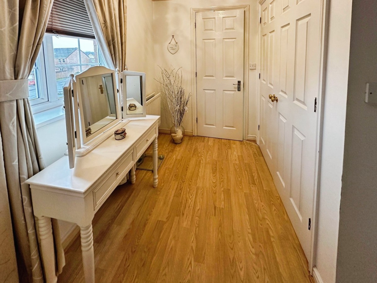 5.9m x 3.7m (19' 4" x 12' 2") Max. Overlooking the front via PVCU double glazed window with fitted Venetian blinds, Laminate floor. Two double and a single fitted wardrobe and a door into the ensuite.