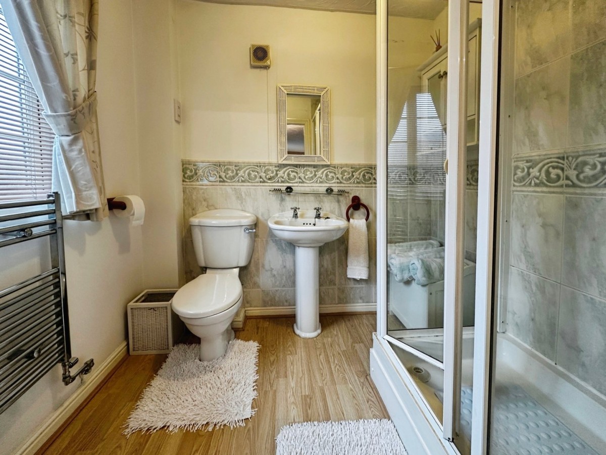 Overlooking the front via PVCu frosted glazed window with a fitted Venetian blind. Finished with a laminate floor and three-piece suite in white with WC, wash hand basin and large shower with concertina glazed door with a plumbed shower. ceramic tiles to all splashback areas and a wall mounted heated chrome towel.