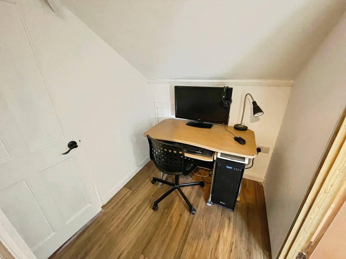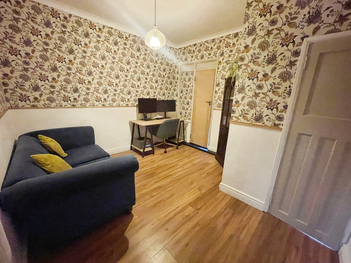2.30m x 3.60m (7' 7" x 11' 10") Emulsioned and coved ceiling, papered walls, access to eaves, laminate flooring, PVCu window to the side of the property, radiator and door leading to the w.c.
