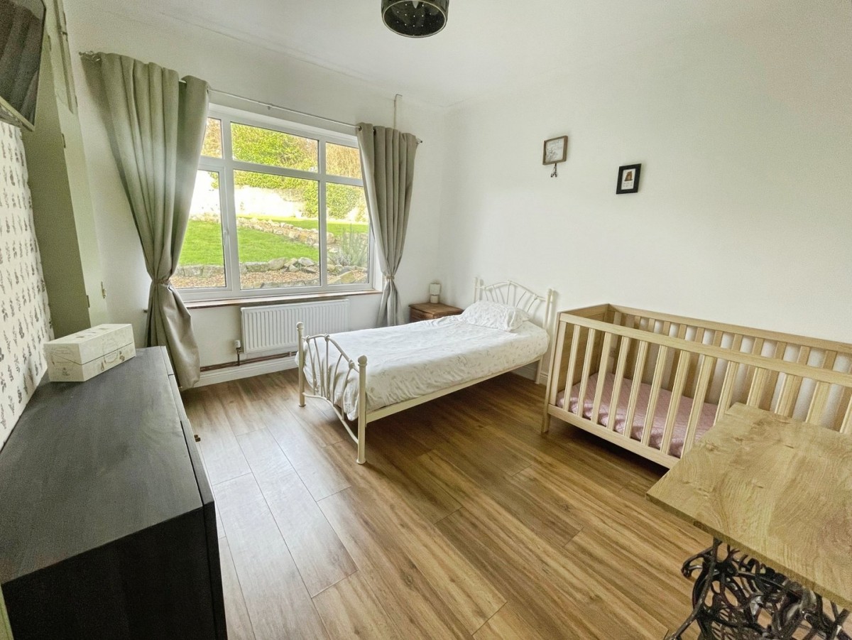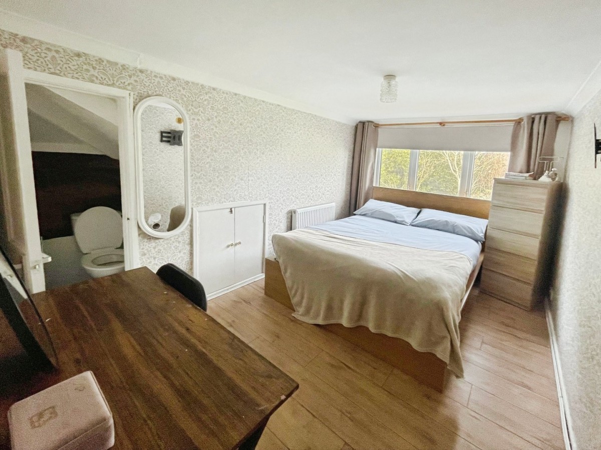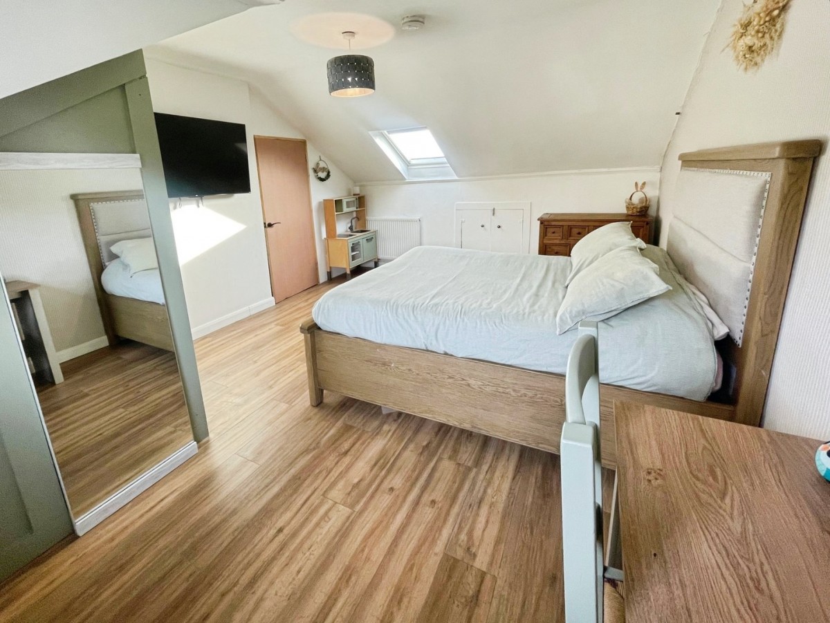 3.70m x 4.80m (12' 2" x 15' 9") Emulsioned ceiling and walls with one feature papered wall, velux window, PVCu window to the rear of the property, built in storage, radiator and laminate flooring.