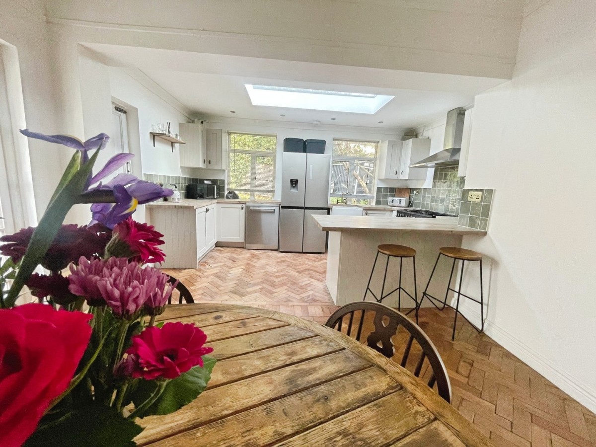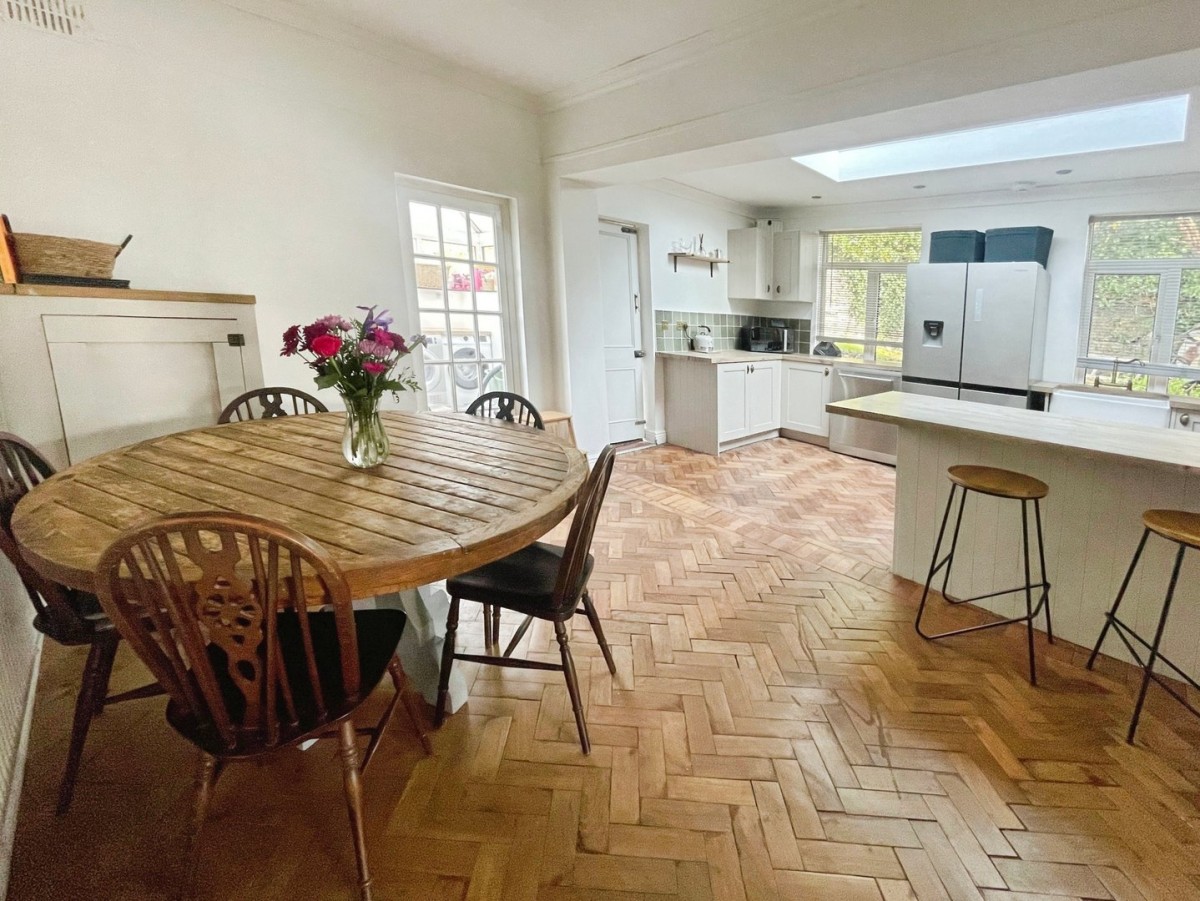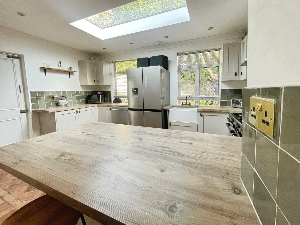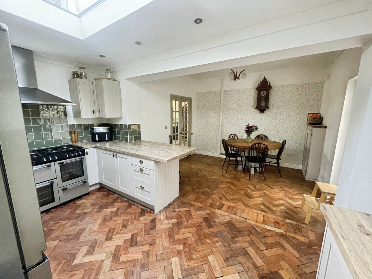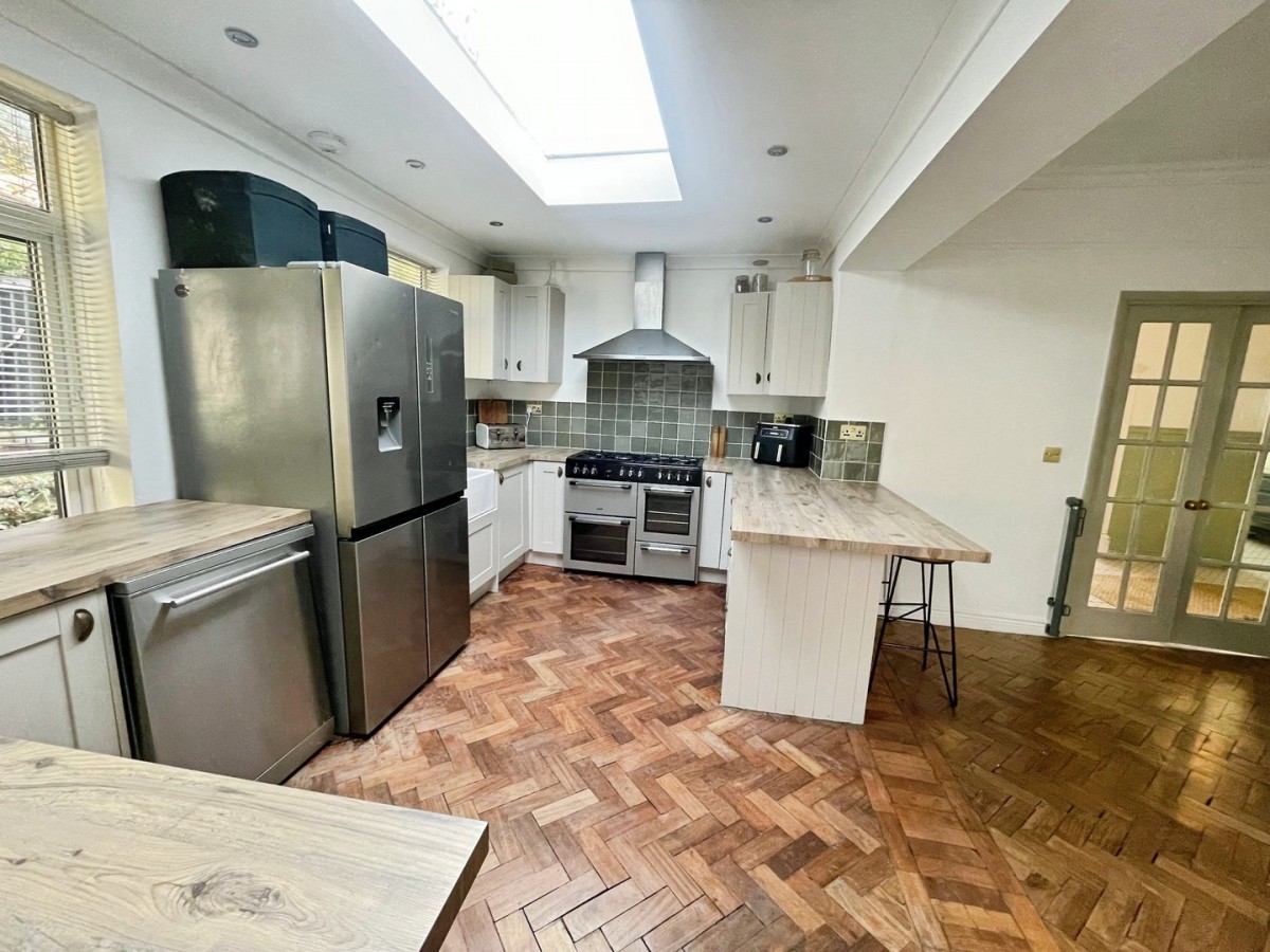 4.40m x 5.80m (14' 5" x 19' 0") Emulsioned and coved ceiling with spot lights, picture rail, feature papered wall, tiling to the splash back areas, original parquet wooden flooring and door leading into the utility. A range of base and wall units with wooden work surfaces housing a Belfast sink with brass mixer tap. Freestanding Range style cooker with stainless steel extractor hood above. Space for freestanding dishwasher. Feature skylight and PVCu windows to the side of the property with fitted blinds. Breakfast bar and radiator.