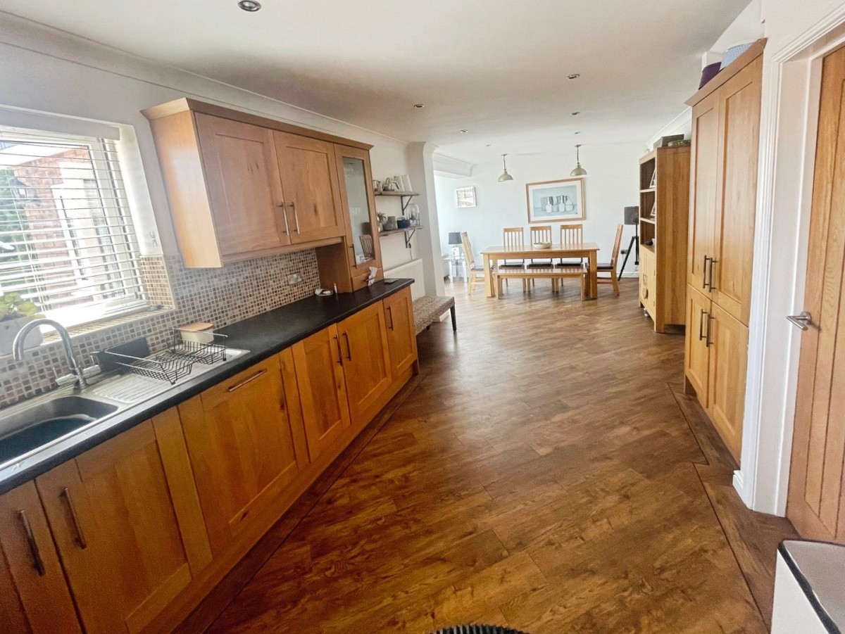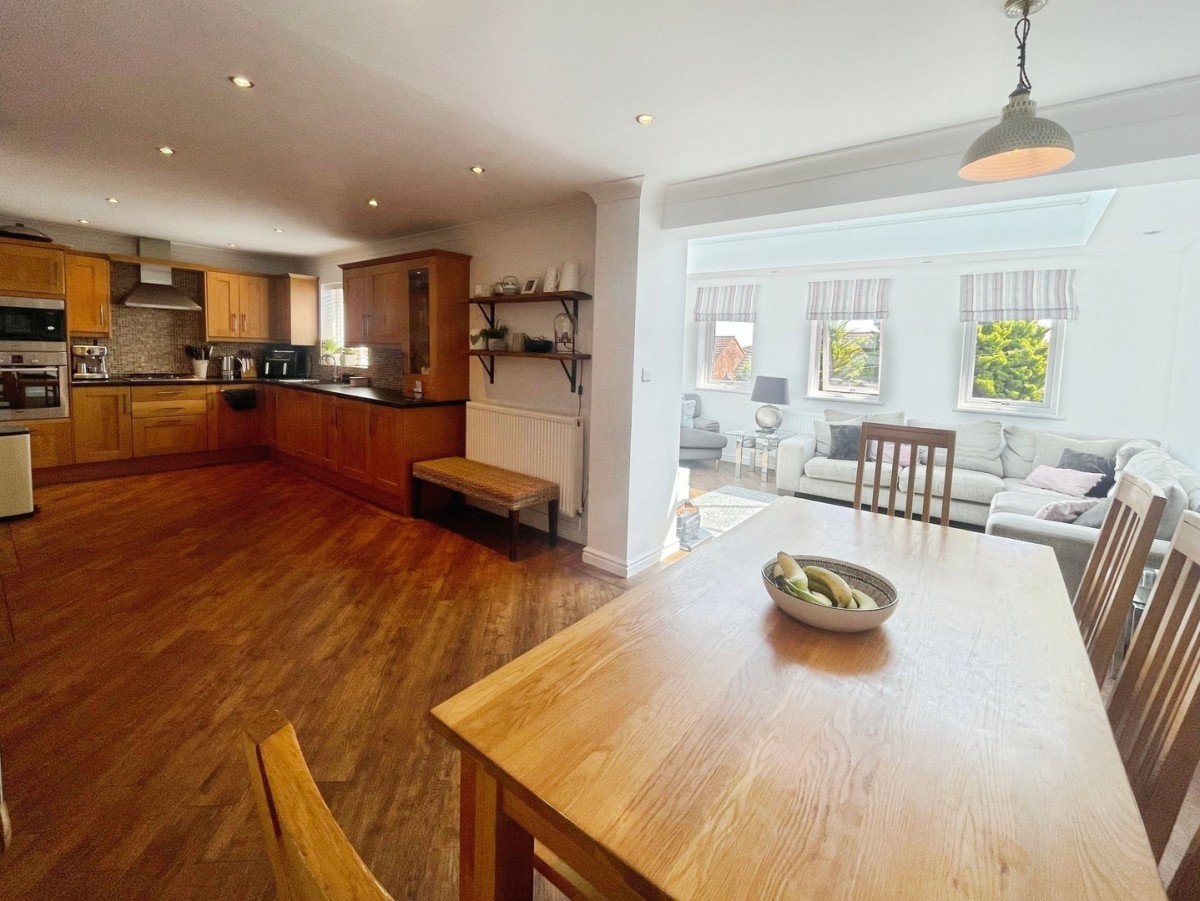 8.20m x 3.20m (26' 11" x 10' 6") Emulsioned and coved ceiling, spot light, decorative lights over the dining table area, emulsioned walls with tiling to splash back areas, radiator, PVCu window overlooking the rear garden and Karndean flooring. A range of wall and base units with complementary work surface. Built in microwave and oven. Four ring gas hob with overhead extractor hood. Built in dishwasher. Franke stainless steel sink and drainer with mixer tap. Opening into the Orangery. Door leading to utility room.
