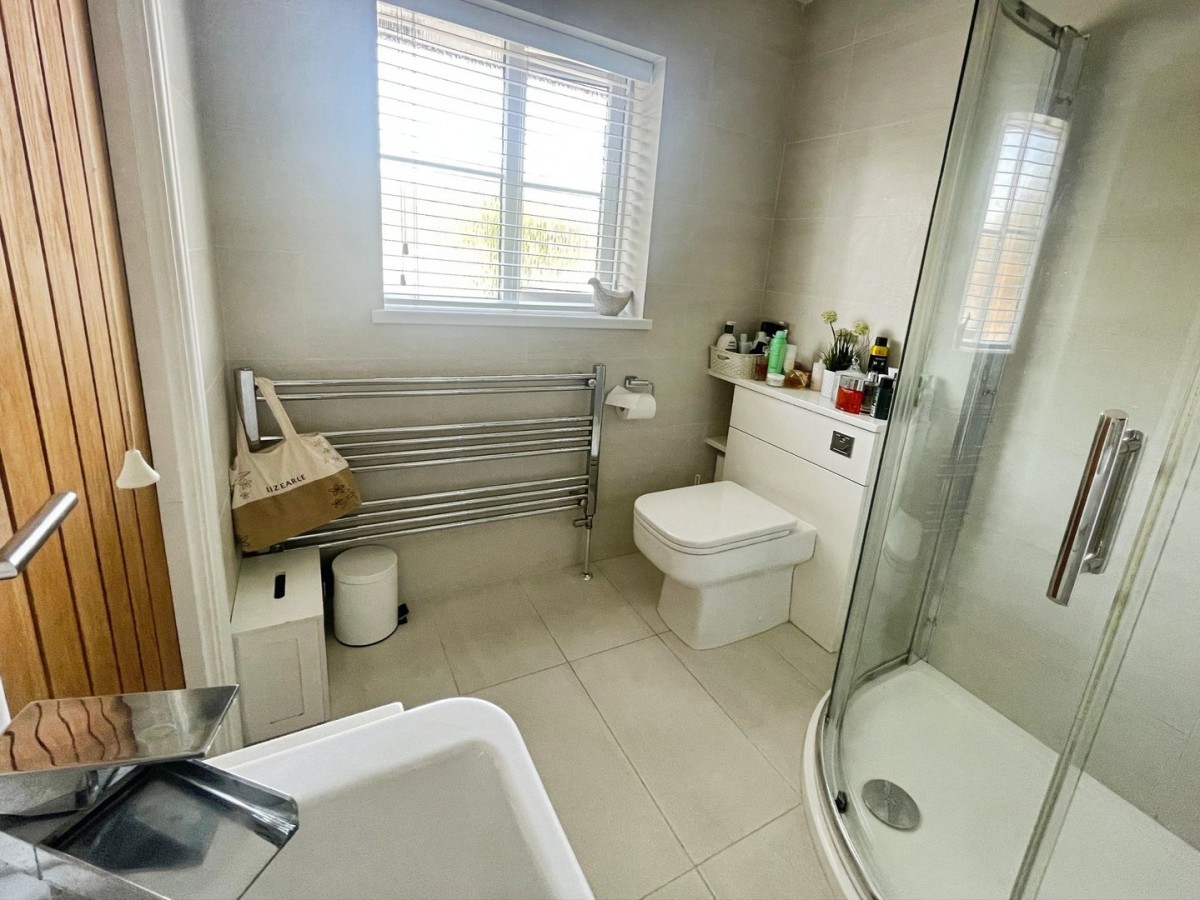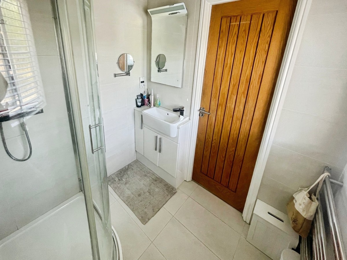 Artexed ceiling, emulsioned walls, wall mounted security system, frosted PVCu window overlooking the front of the property, radiator and Karndean flooring. Two piece suite comprising low level WC and corner wall mounted sink with tiling to splash back area and mirror above.