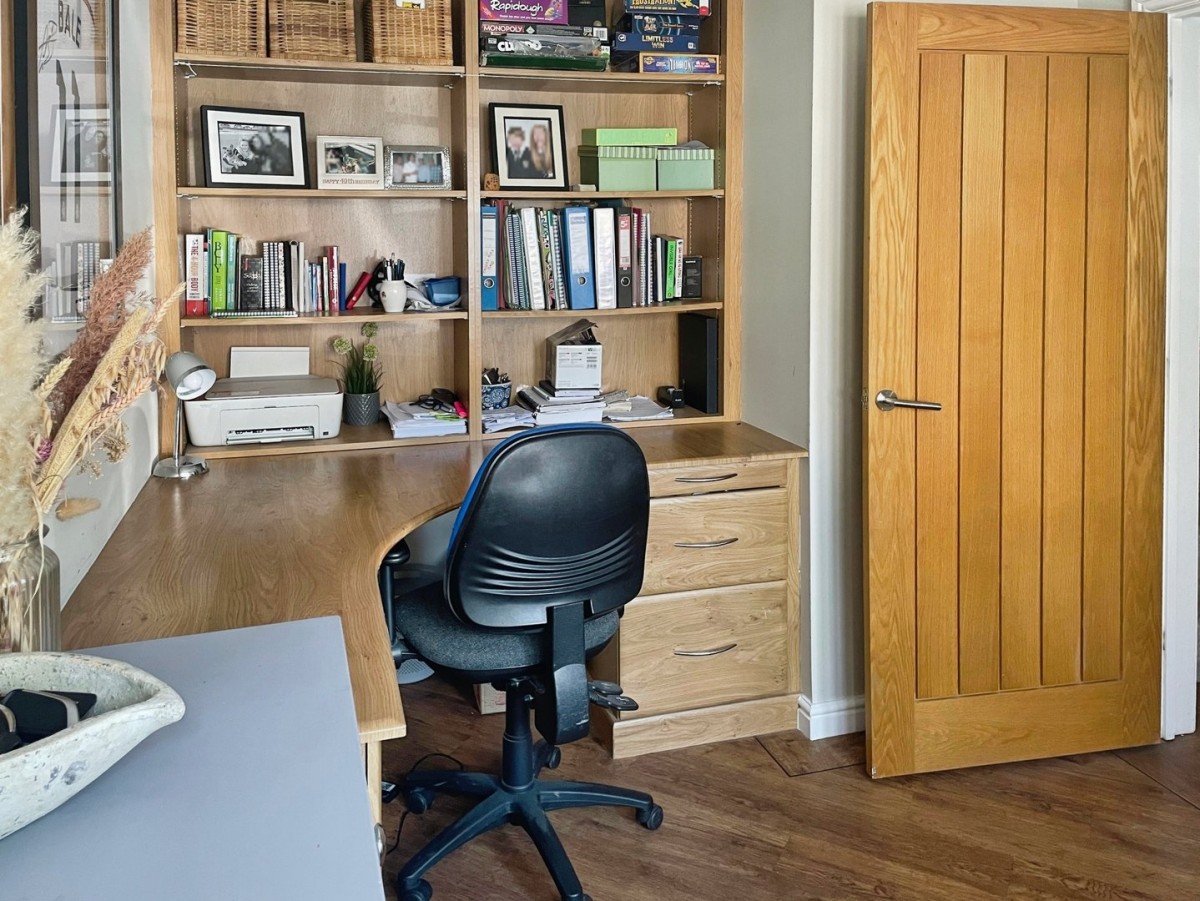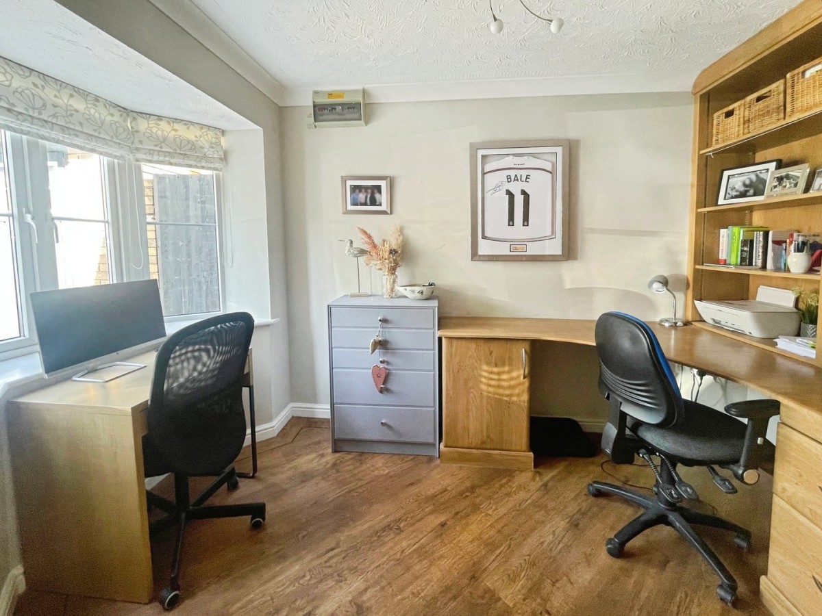 3.40m x 2.50m (11' 2" x 8' 2") PVCu bay window to the front, artexed ceiling, emulsioned walls, Karndean flooring and radiator. Fitted shelving and desk area.