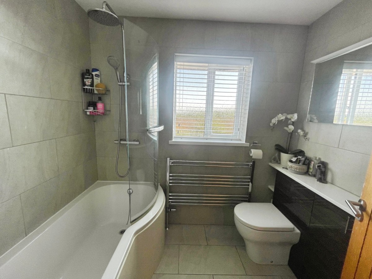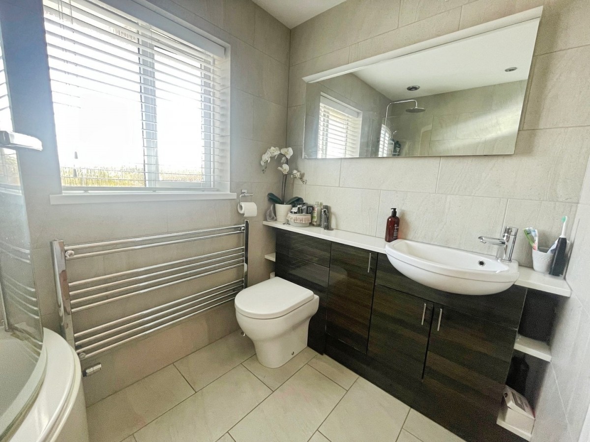 Emulsioned ceiling, spot lights, extractor, tiled walls, chrome towel rail and tiled flooring. Three piece suite comprising vanity unit with quartz work surface housing the WC and sink with mixer tap, P shaped bath with rainforest shower head and hand attachment. Electric mirror and PVCu frosted window to the rear of the property.