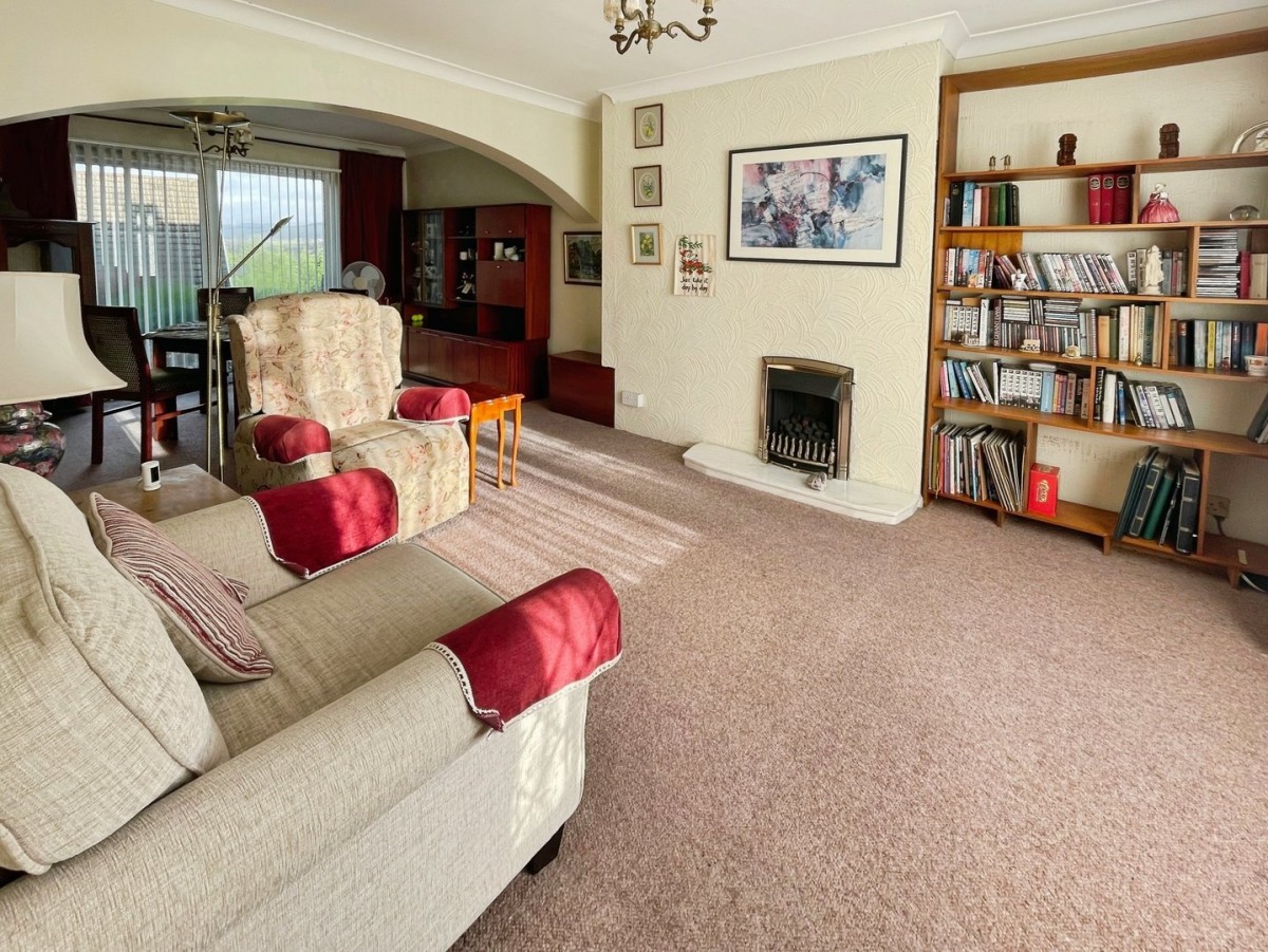 3.60m x 7m (11' 10" x 23' 0") Emulsioned and coved ceiling, papered walls, fitted carpet, PVCu window overlooking the front of the property with attractive rooftop mountain views and PVCu sliding doors leading to the rear garden. Marble hearth housing a gas fire with shelving in the alcoves. Radiator and serving hatch to the dining area.