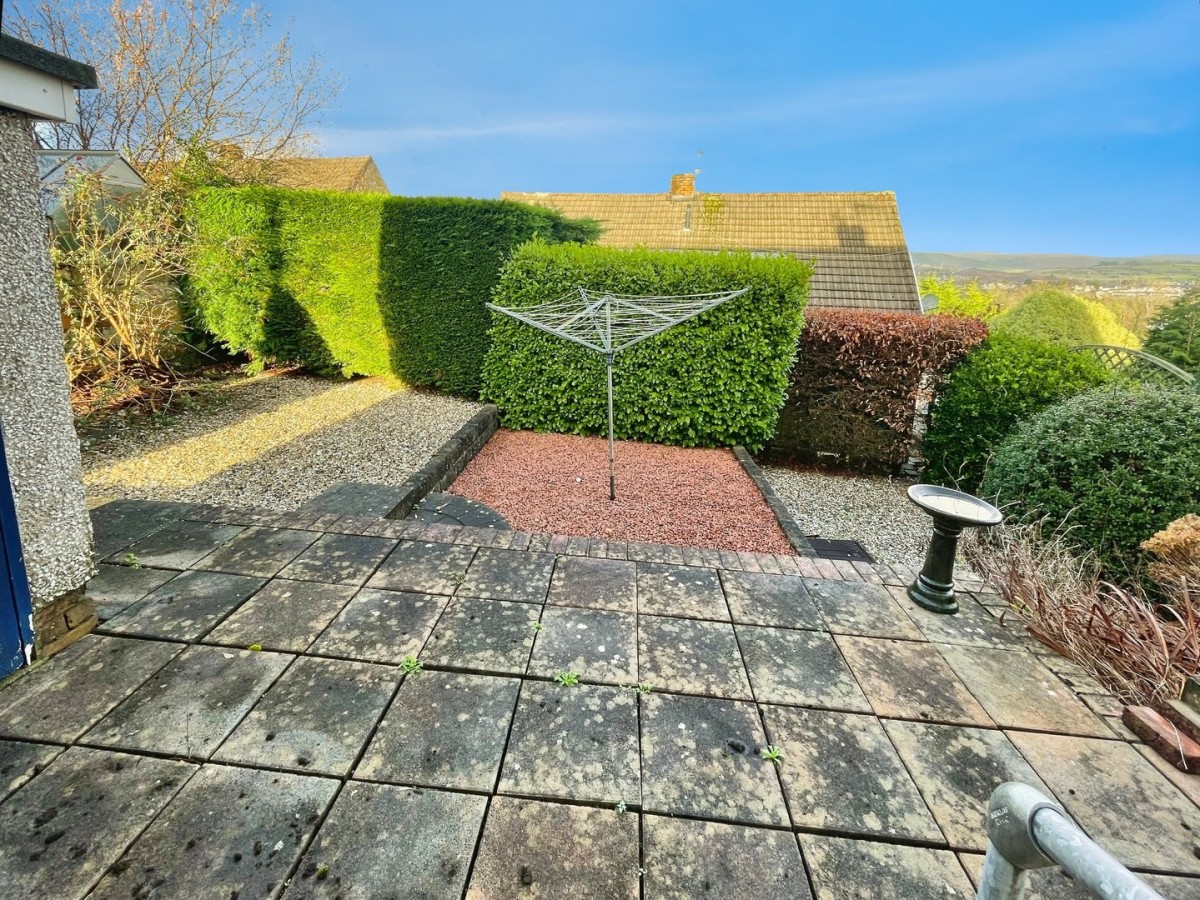 The garden is enclosed with mature hedgerow and fencing, patio area and step down to the garden laid to decorative stone. External stone outbuilding with wooden door.