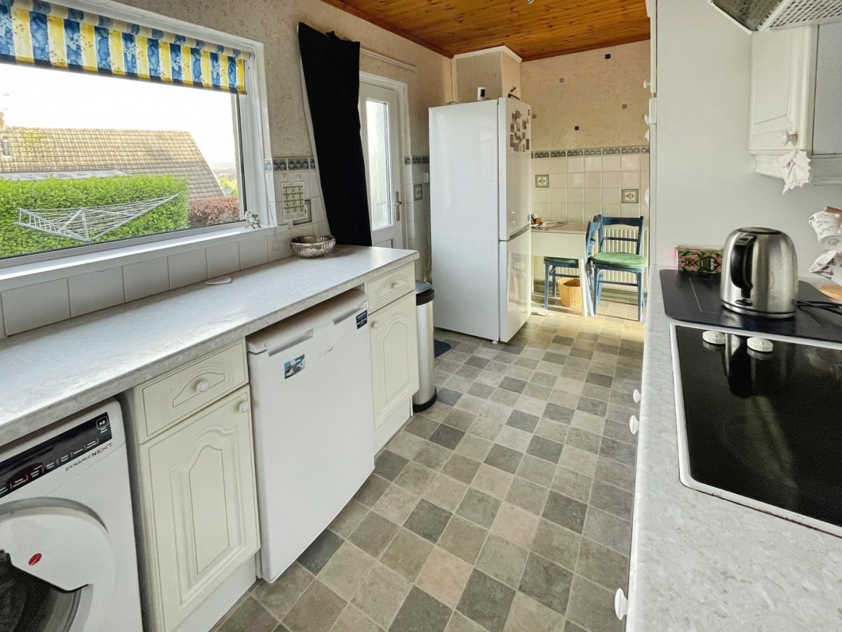 3.40m x 4.80m (11' 2" x 15' 9") Wooden panelled ceiling, part papered / part tiled walls and tile effect vinyl flooring. A range of wall and base units with complementary work surfaces. Ceramic four ring electric hob with extractor above and built in oven. Stainless steel one and half sink drainer with stainless steel mixer tap. Space for fridge and washing machine and built in shelving. Door leading to the pantry, PVCu windows overlooking the side and rear of the property and PVCu frosted glazed door leading out to the rear.