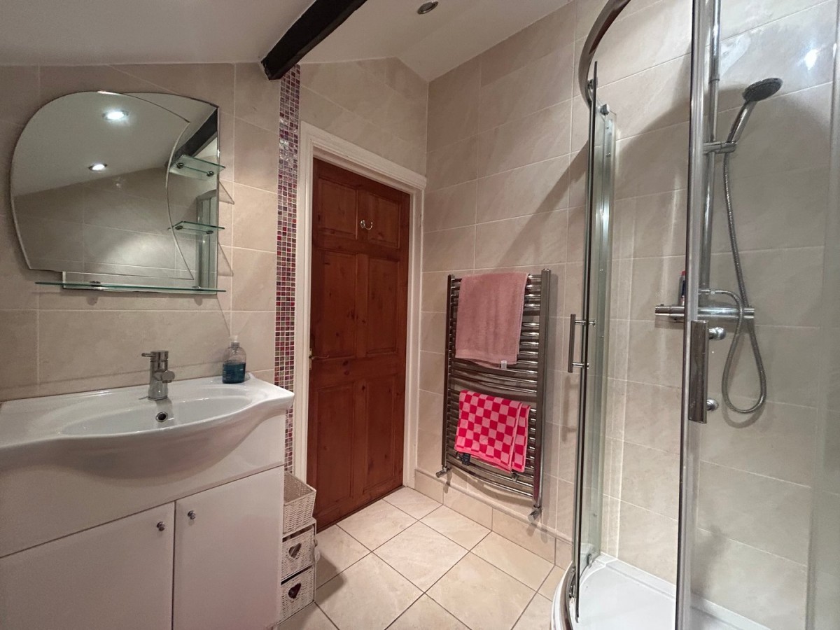 1.66m x 1.68m (5' 5" x 5' 6") Skimmed and emulsioned vaulted ceiling with inset spot lights, extractor, full tiled walls and tiled flooring. Three piece suite comprising corner shower with wall mounted chrome waterfall shower, low level WC and wash hand basin with chrome mixer tap and vanity unit. Chrome wall mounted towel rail.