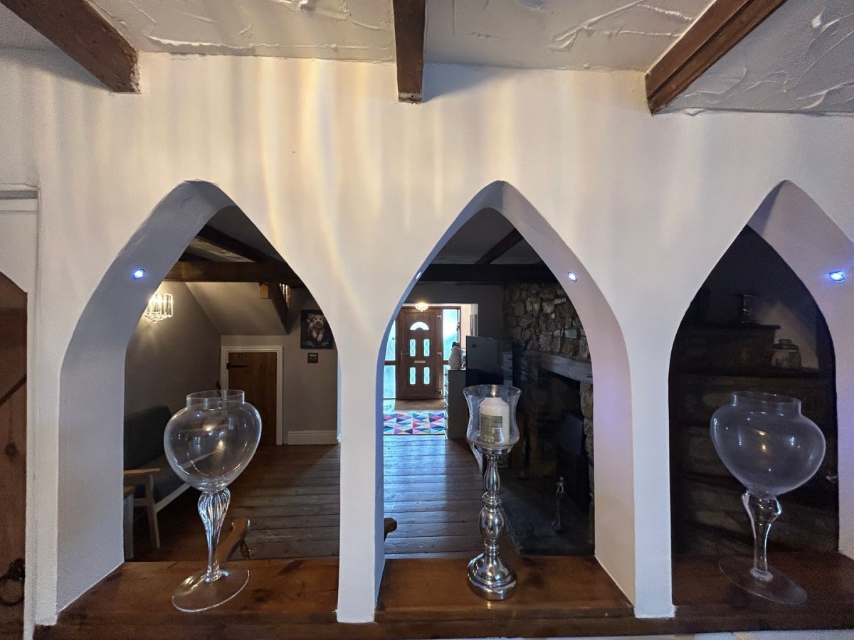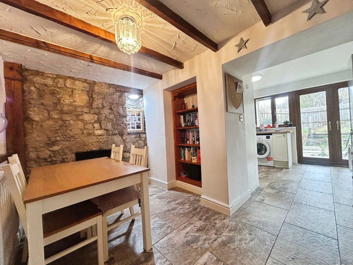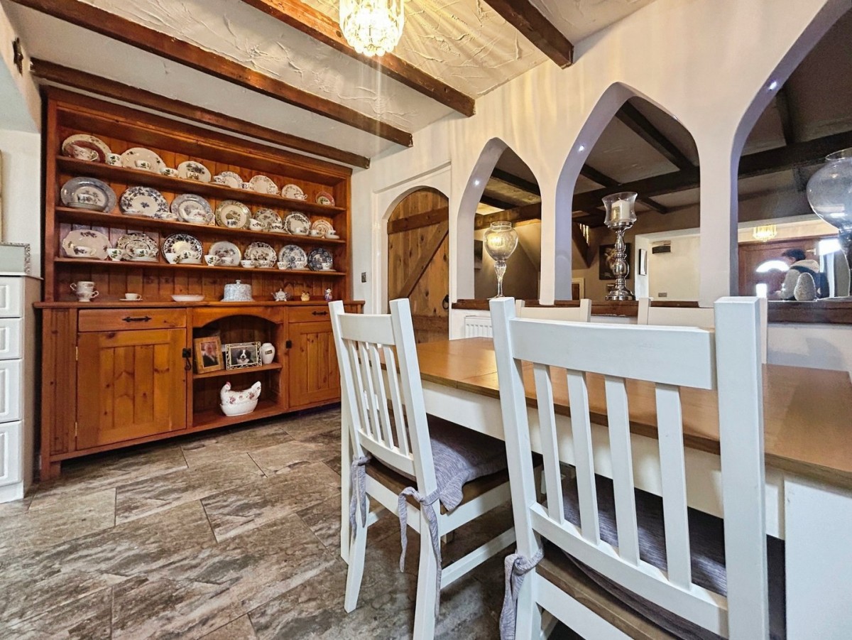 3.77m x 1.89m (12' 4" x 6' 2") Leading from the lounge via a wooden door, textured ceiling with beams, featured exposed stone wall, radiator, decorative open arches to allow the light to flow through, tiled flooring, beautiful welsh dresser to remain.