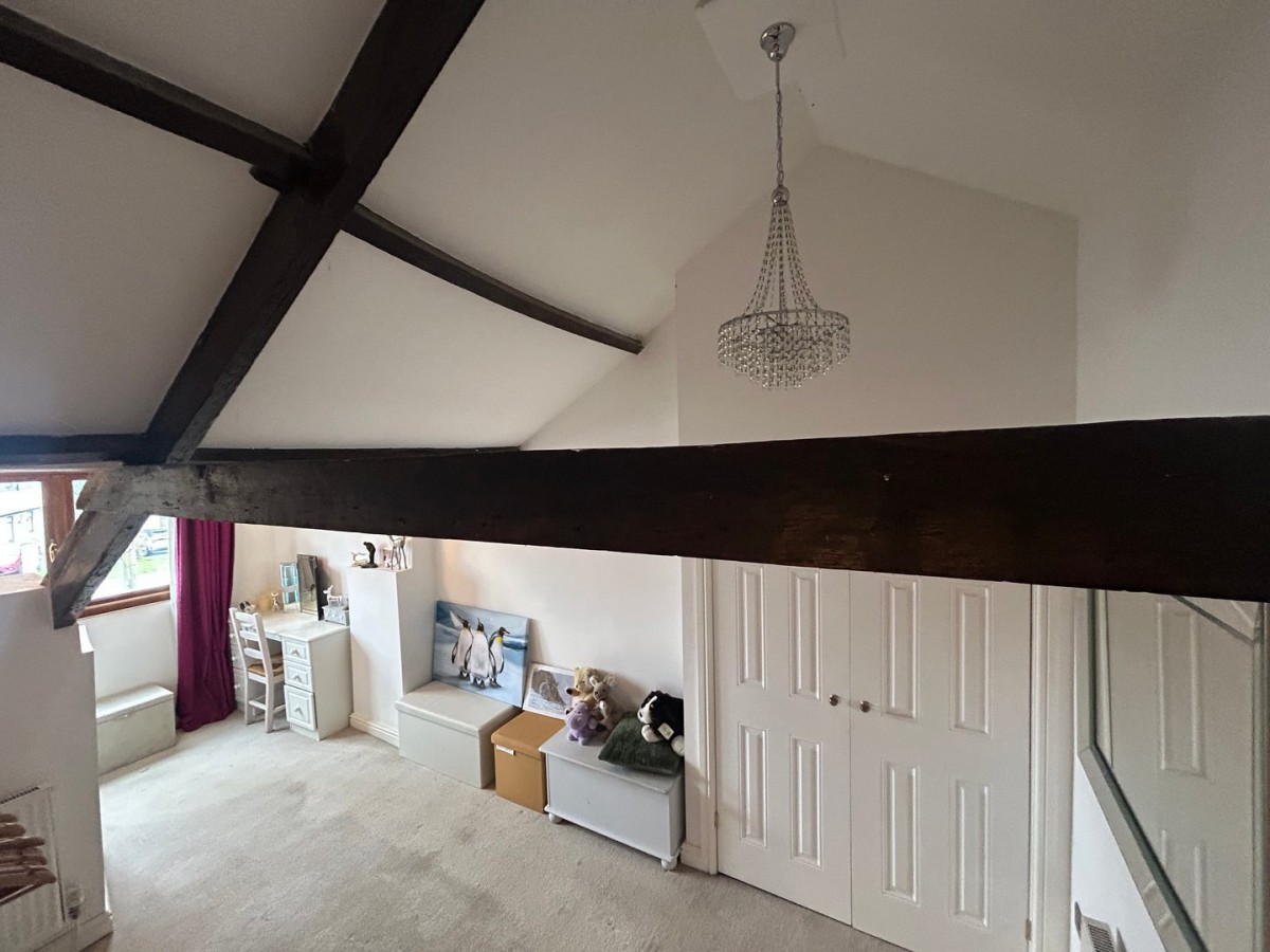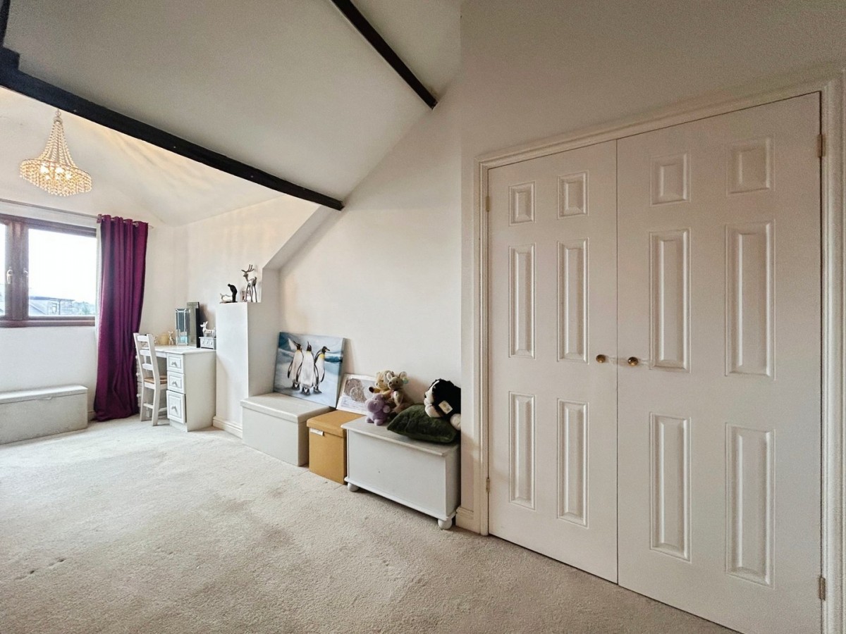 2.64m x 3.47m (8' 8" x 11' 5") Skimmed and emulsioned ceiling with centre light and wooden beams, emulsioned walls, skirting, fitted carpet, radiator and eaves storage. PVCu French doors leading out to the balcony with views over the woodlands.